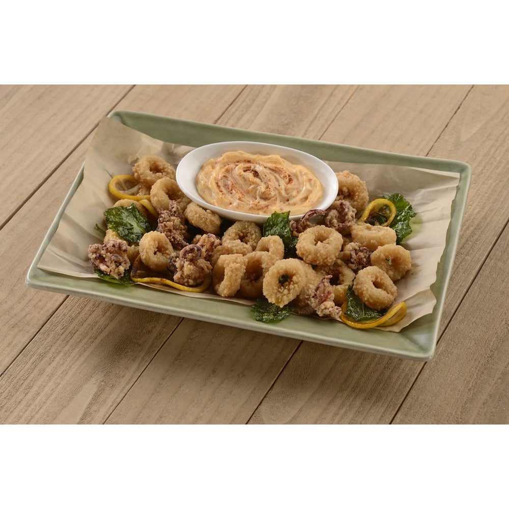 These calamari rings and tentacles are part of the Dipt'n Dusted product line. Lightly dusted with a home-style batter and flour blend, this calamari has a made-from-scratch appearance ideal for use in a variety of applications.