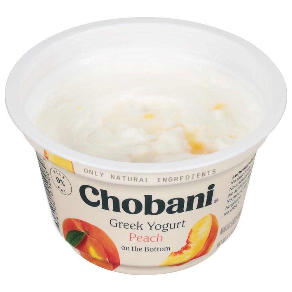 This Chobani brand of Nonfat, peach Greek yogurt is rich and creamy, with a "Fruit on the Bottom" peach topping.