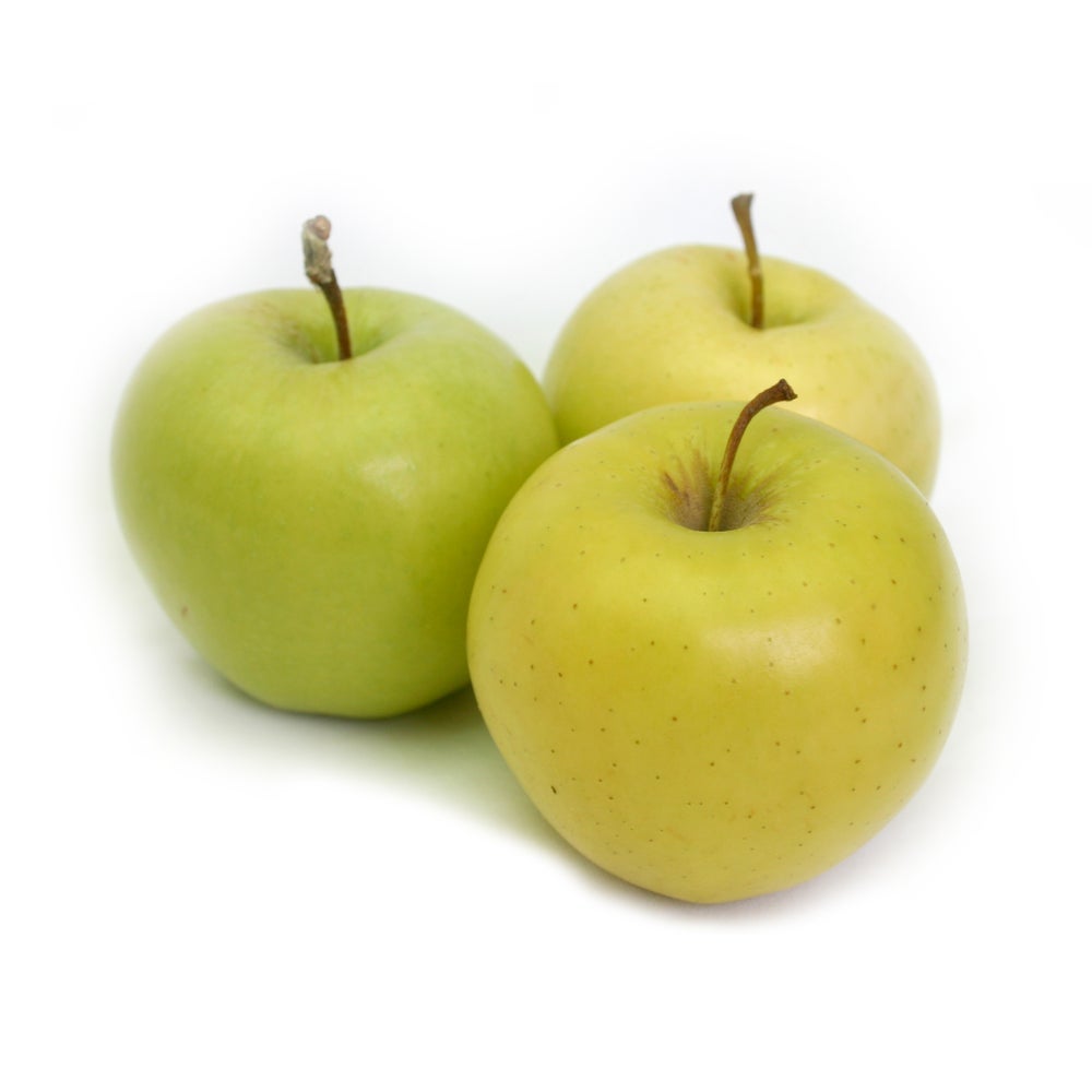 - Enjoy a sweet flavor with a hint of tartness in these Golden Delicious apples. They're medium to large, and red-striped with an orange-red blush on a yellow background. The flesh is cream-colored, crisp and juicy.