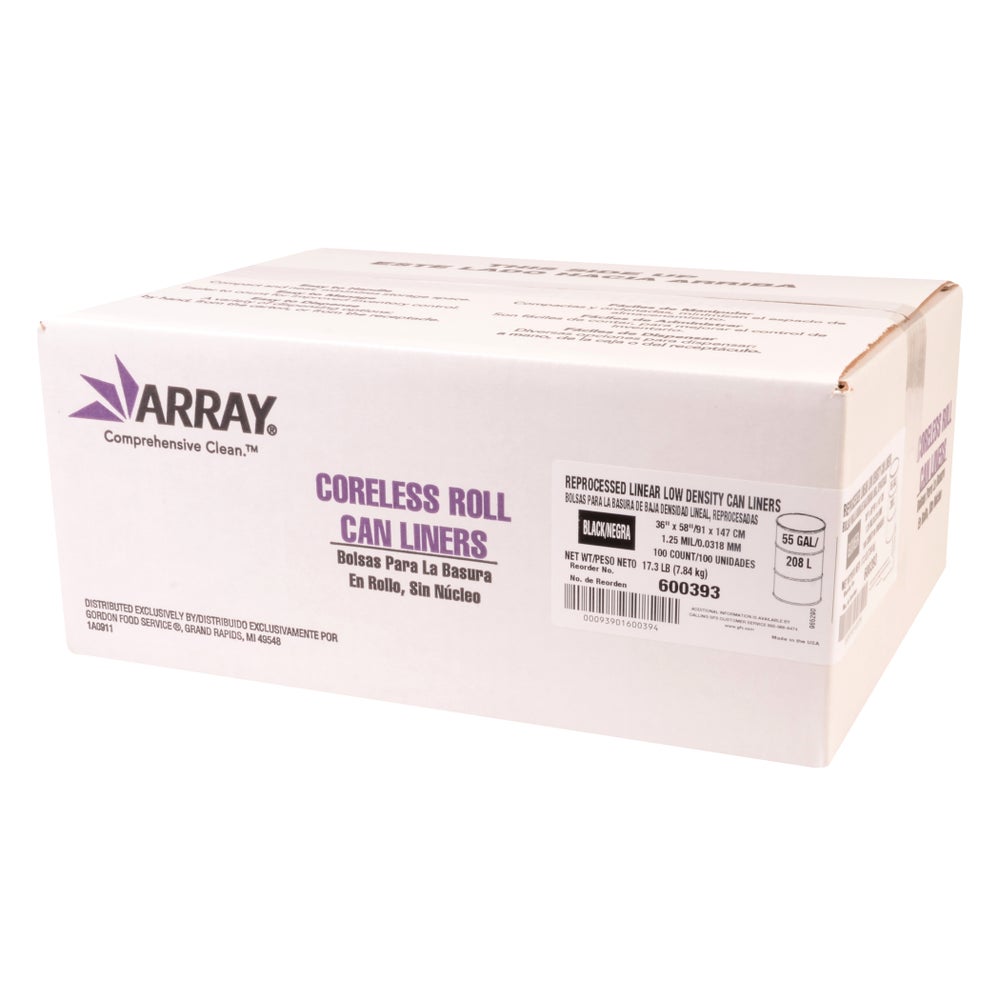 Array 55 Gallon Black Can Liners, Reprocessed, 1.24 Mil, 36 x 58 Inches, 20 Ct Roll, 5/Case