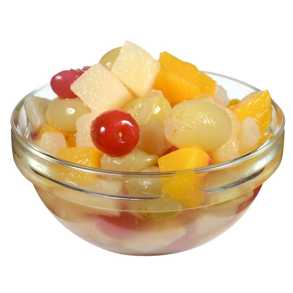 - Fruit was picked at the peak of freshness and prepared for you. This fruit is a blend of diced, yellow cling peaches, peeled pears, whole seedless grapes, sweet cherries and pineapple tidbits. The blend of fruit is packed in juice to provide a light and fresh-tasting fruit salad.