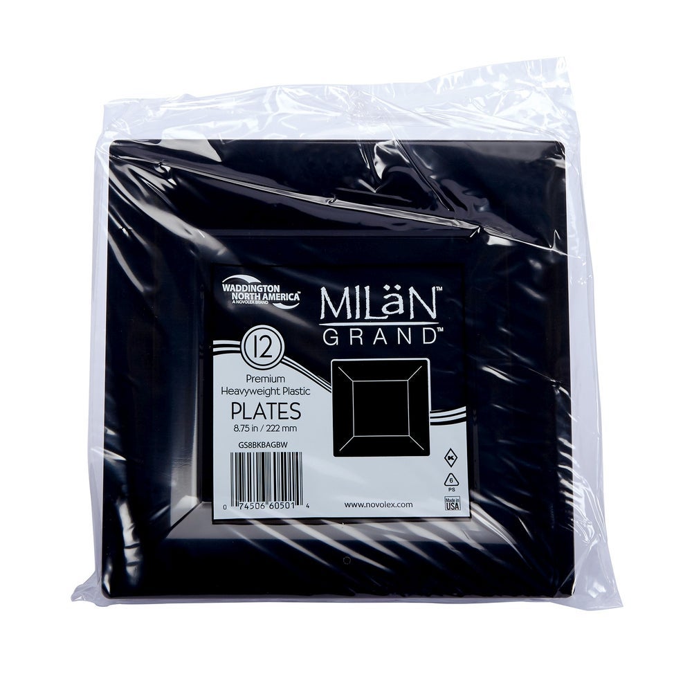 Milan 8 Inch Plastic Plates, Black, Square, Polystyrene, 12 Ct Package, 14/Case