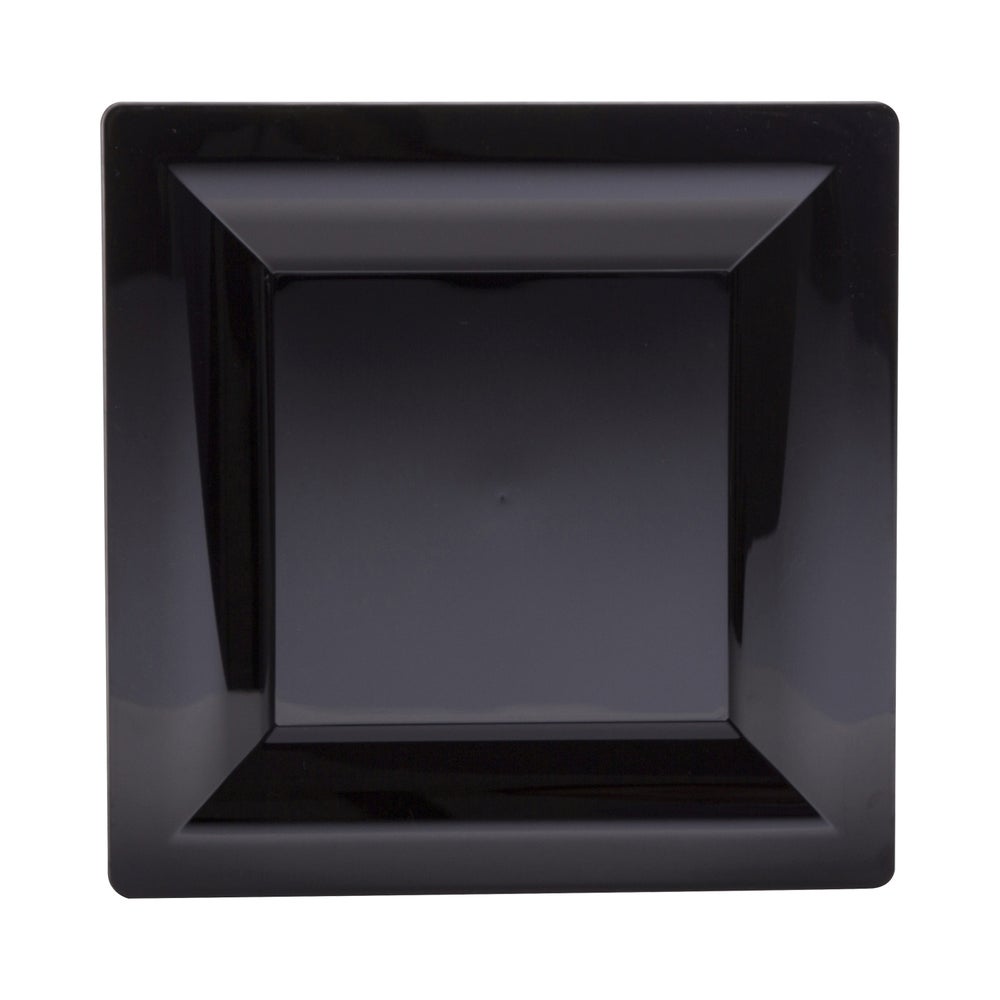 Made from heavy-duty, rigid plastic, these trendy, black square plates offer an attractive presentation to a variety of applications.