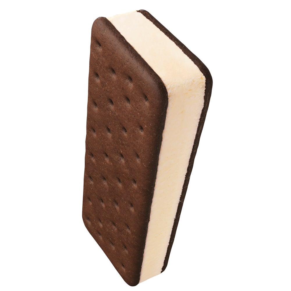 Rich and velvety vanilla ice cream is sandwiched between two chocolate wafers, providing a ready-to-eat, frozen treat.