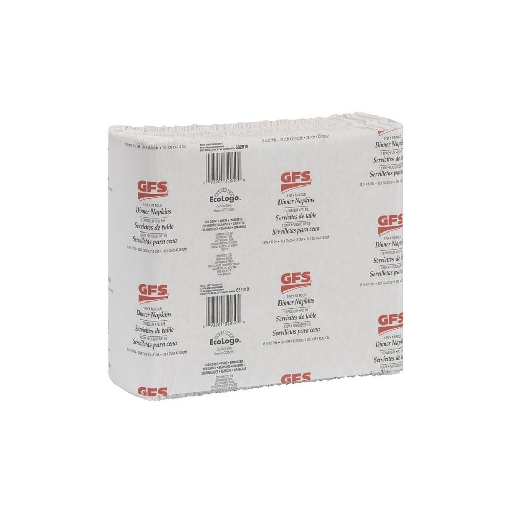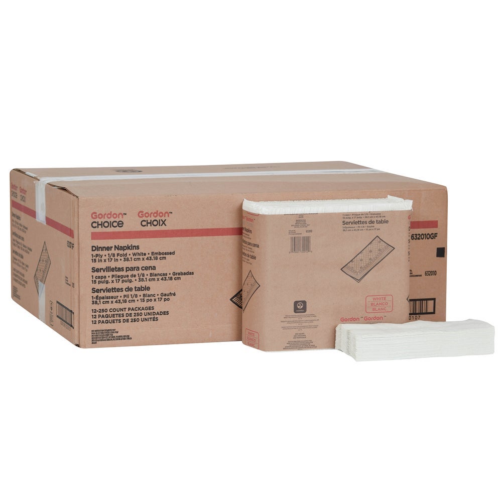 Gordon Choice 1-Ply Embossed Dinner Napkins, White, 1/8 Fold, 15 x 17 Inch, 250 Ct Package, 12/Case