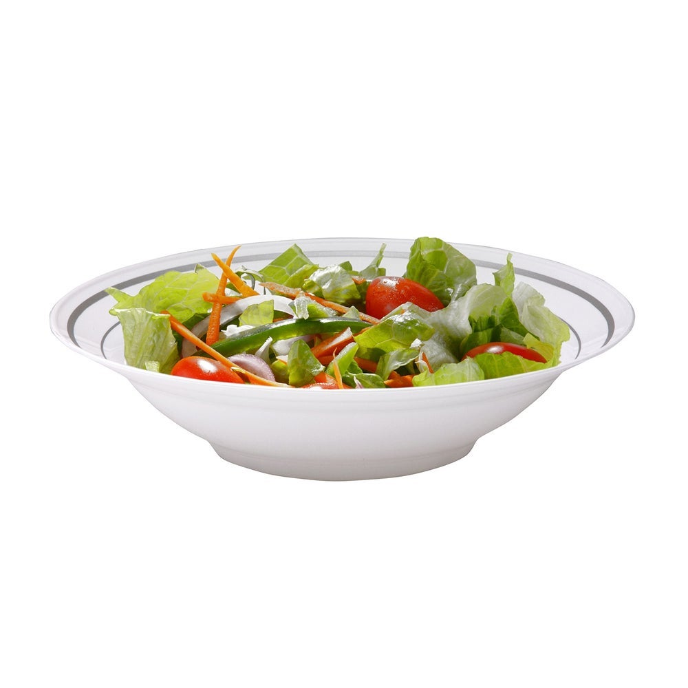 Masterpiece 10 Ounce Plastic Bowls, White with Silver Trim, Polystyrene, 15 Ct Bag, 10/Case