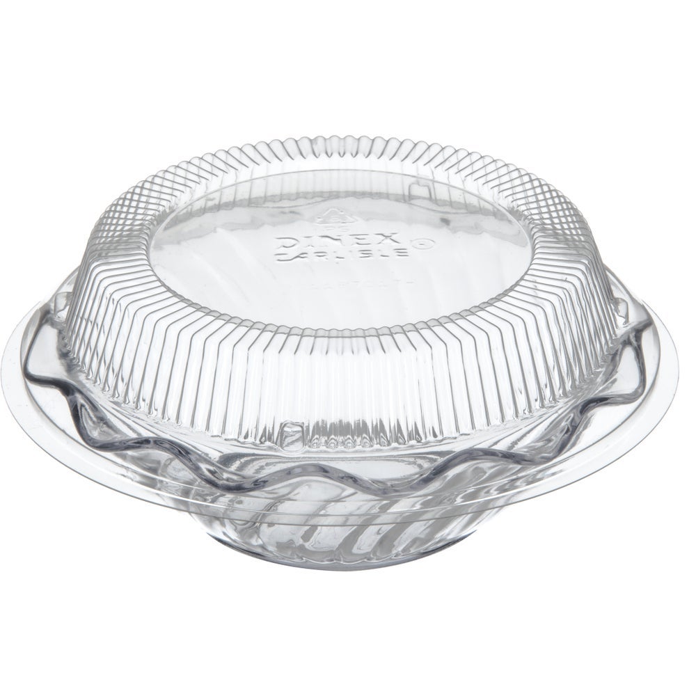 This Dinex disposable clear dome lid fits both the 5-ounce berry dish and 8-ounce tulip bowl.