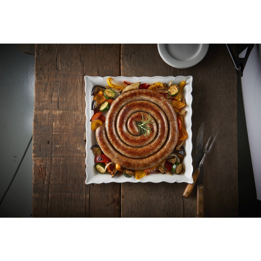 This sausage has the appearance of fresh ground homemade sausage with a traditional, mild, Chivalata-style sweet Italian seasoning. It is made with natural sheep casing and premium cuts of pork with no fillers for a meaty bite, and fresh aroma and flavor after cooking.