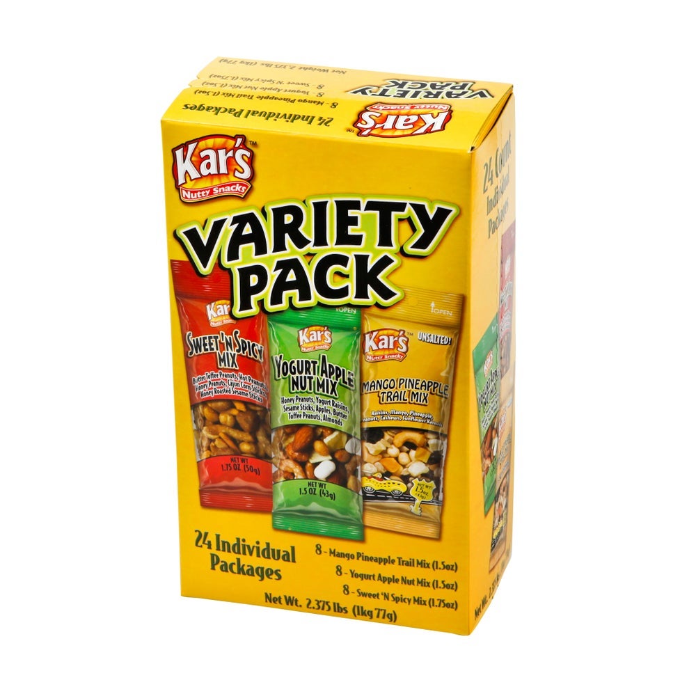 These ready-to-eat, single-serve variety packs include Sweet 'N Spicy trail mix, yogurt apple nut trail mix, and mango pineapple trail mix.