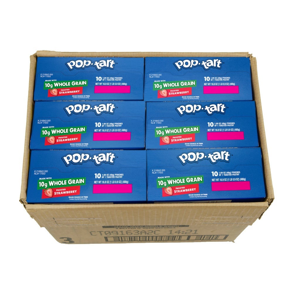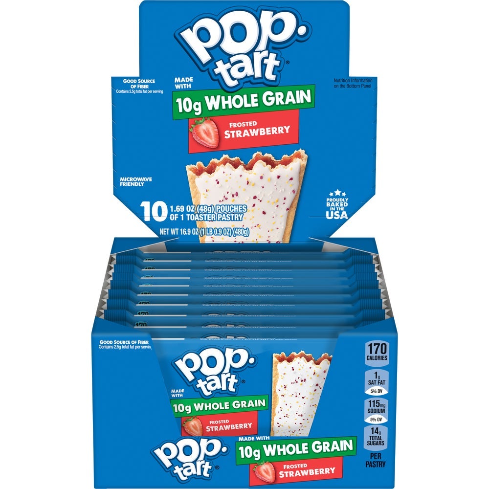 - Pop Tarts Made with Whole Grain toaster pastries in one count pouches, packed in 10 count display trays. Jump start the day with a strawberry flavored filling encased in a pastry crust and topped with frosting and rainbow sprinkles.
