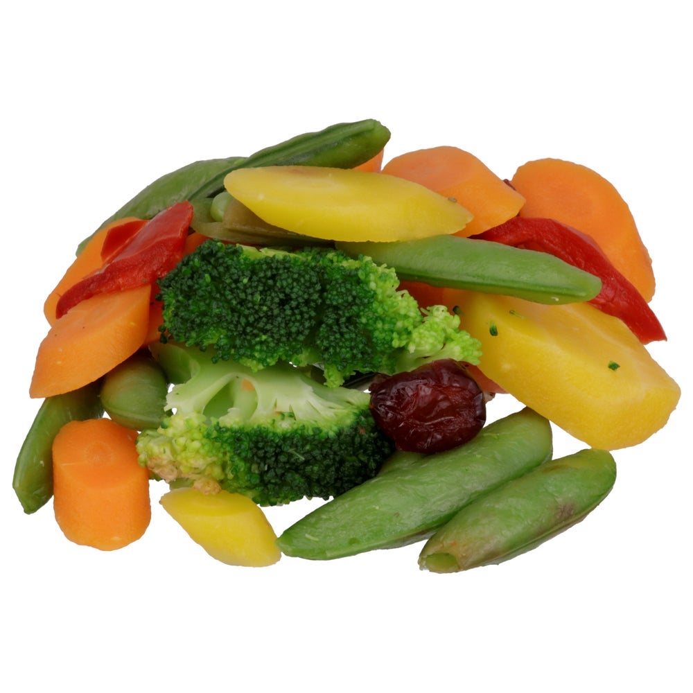 This colorful, versatile, and flavorful blend of vegetables includes broccoli florets, carrots, yellow carrots, sugar snap peas, red peppers, and cranberries. It may be add to pastas or used as a colorful side dish on its own.