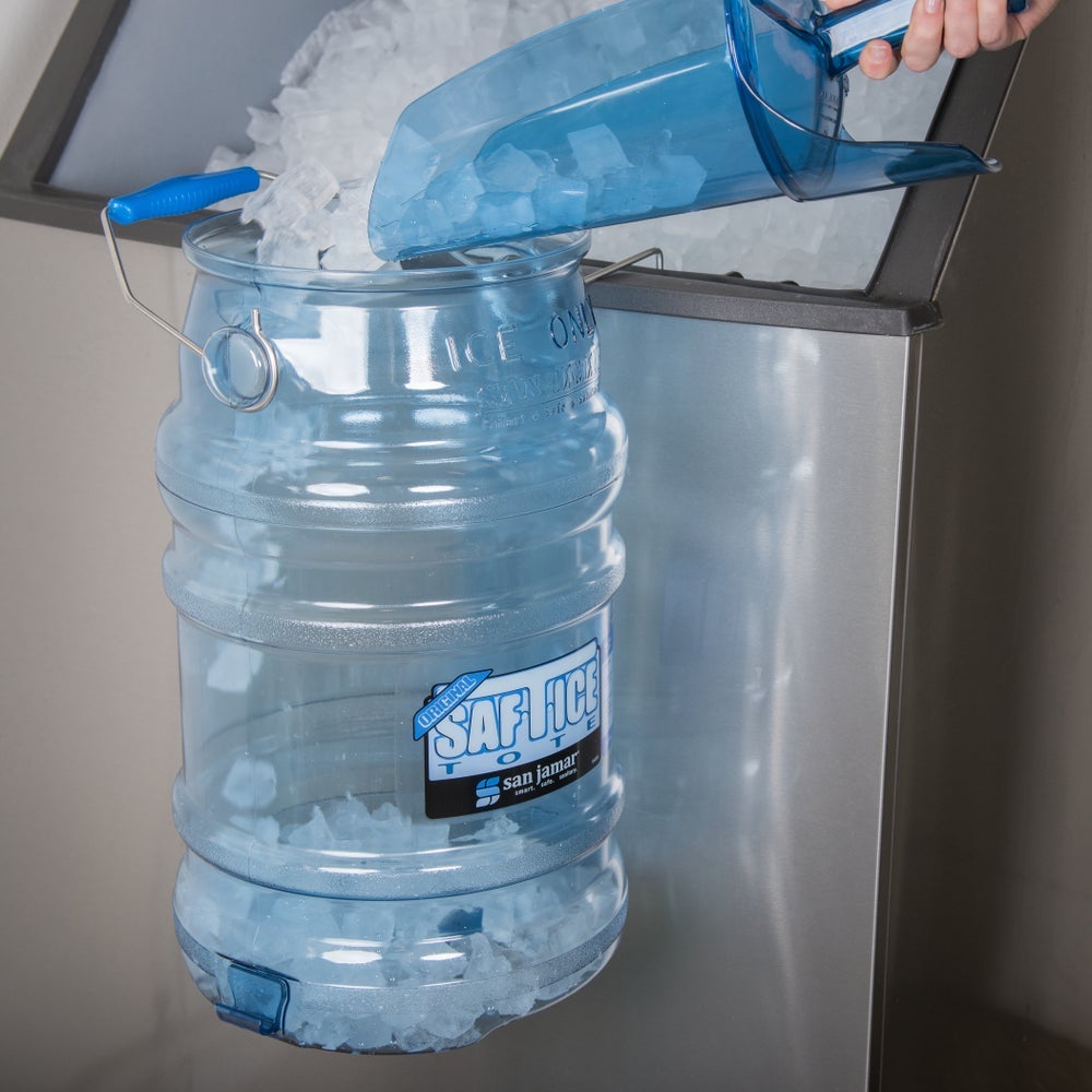 This six gallon ice tote offers a multi-grip design to safely transport ice.