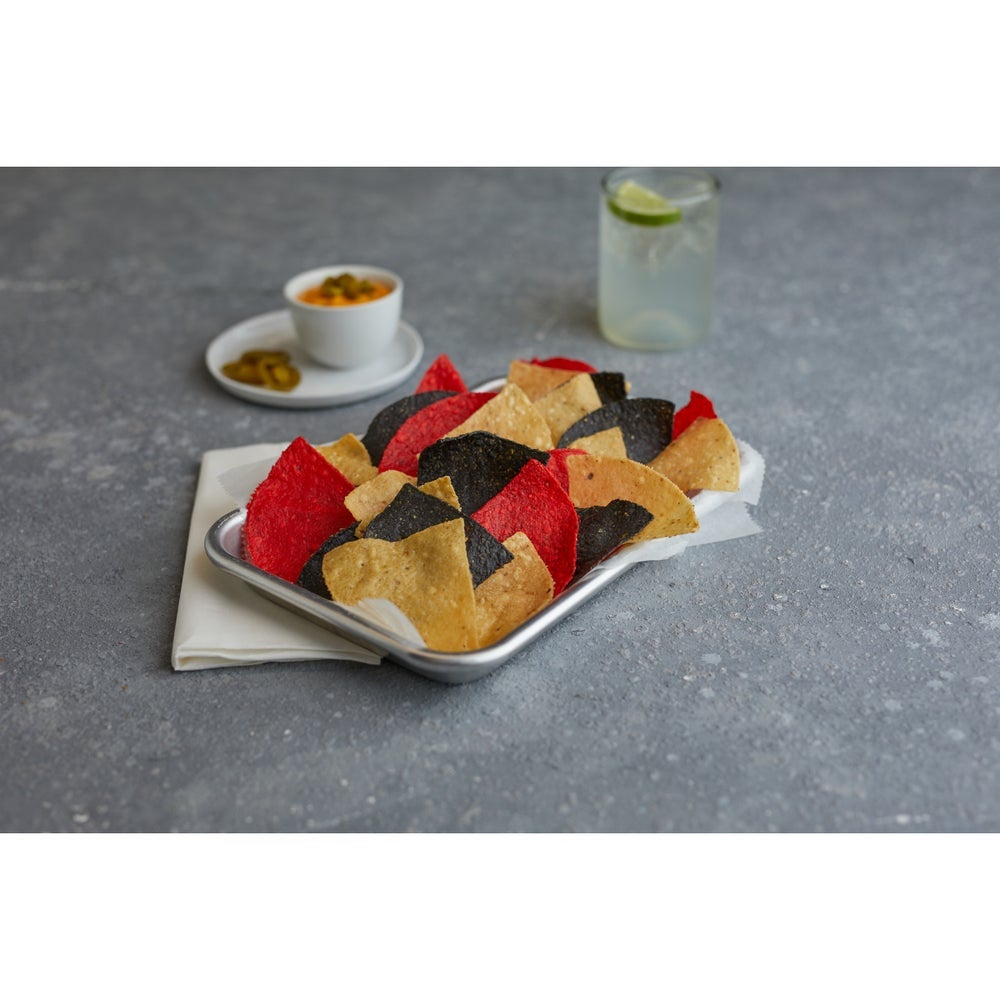 This mixture of red, white, and blue chips is ready to fry. They are made with coarsely stone-ground corn and can be used with salsa, queso, and gourmet nachos.