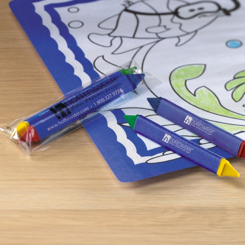 These Hoffmaster brand of crayons are designed with a trianular shape and have two colors in one. Shaped to not roll off the table and packaged in convenient crayon packs to hand out to young diners.