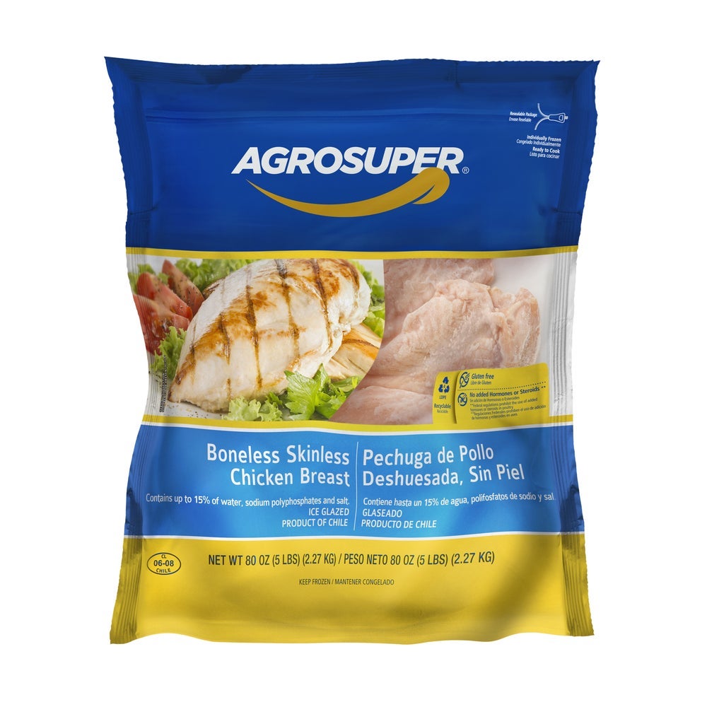 Agrosuper Boneless Skinless Breast Chicken, Frozen, 5 Lb Bag, 8/Case