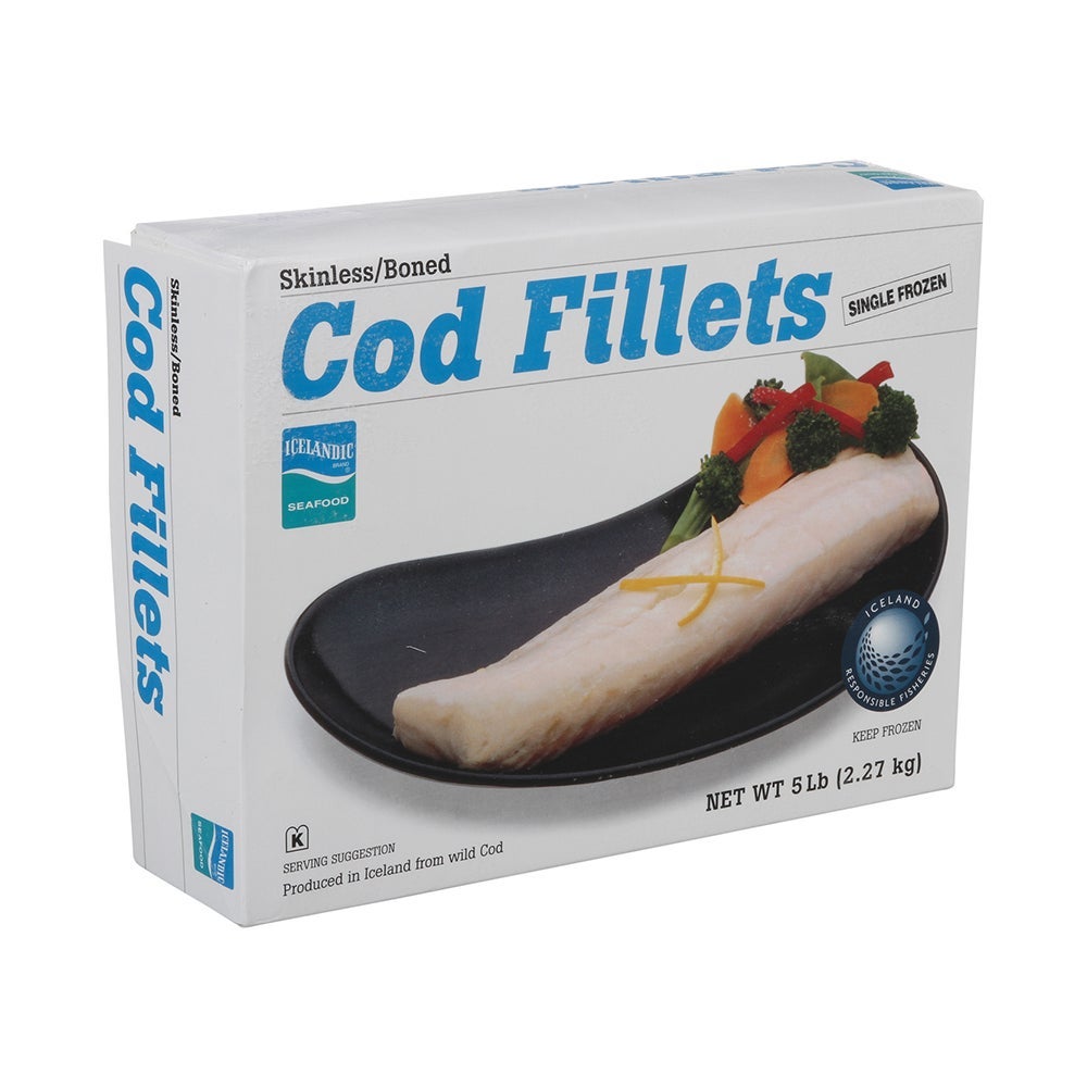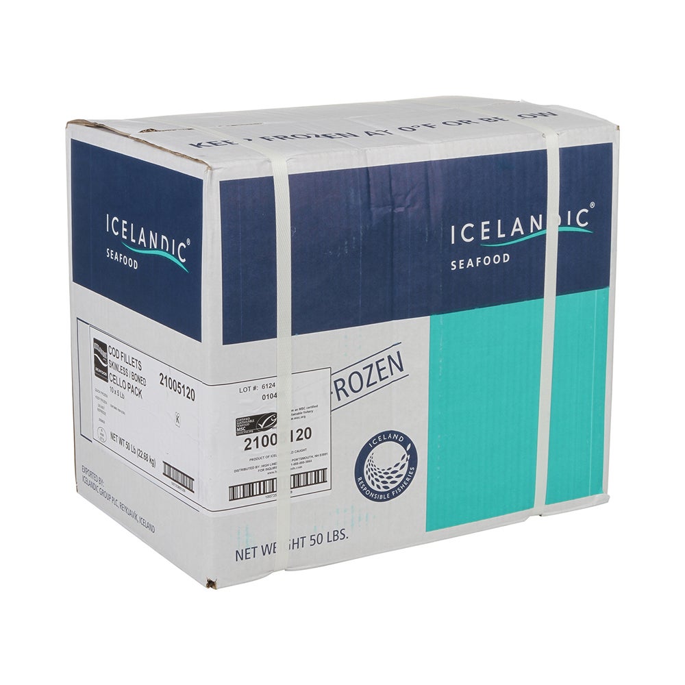 Icelandic Cod Fillets, Wild-Caught, Boneless Skinless, Marine Stewardship Council, 1-2 Count per Wrap, Raw, Once-Frozen Cello-Wrapped, 5 Lb Box, 10/Case