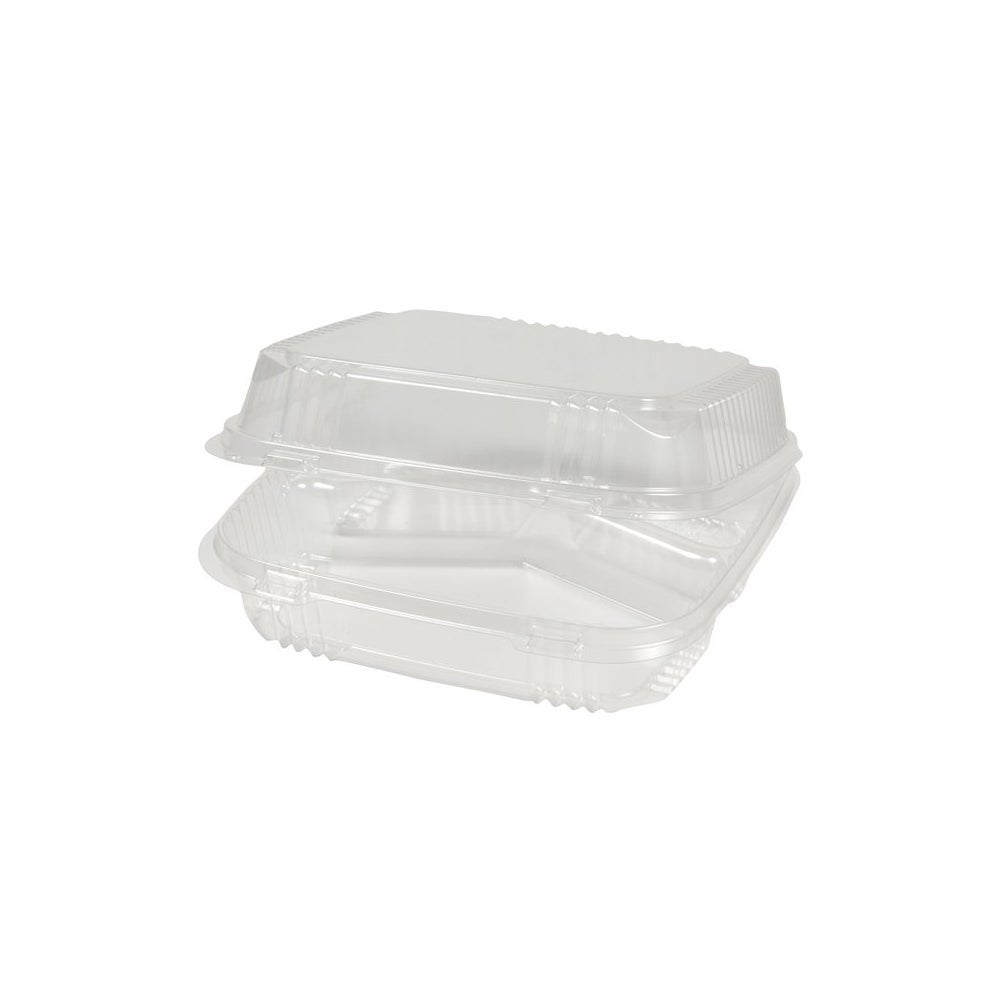 Pactiv 8.2 x 8.3 x 2.9 Inch Plastic 3-Compartment Containers, Clear, Hinged, Polystyrene, 200 Ct Package, 1/Case
