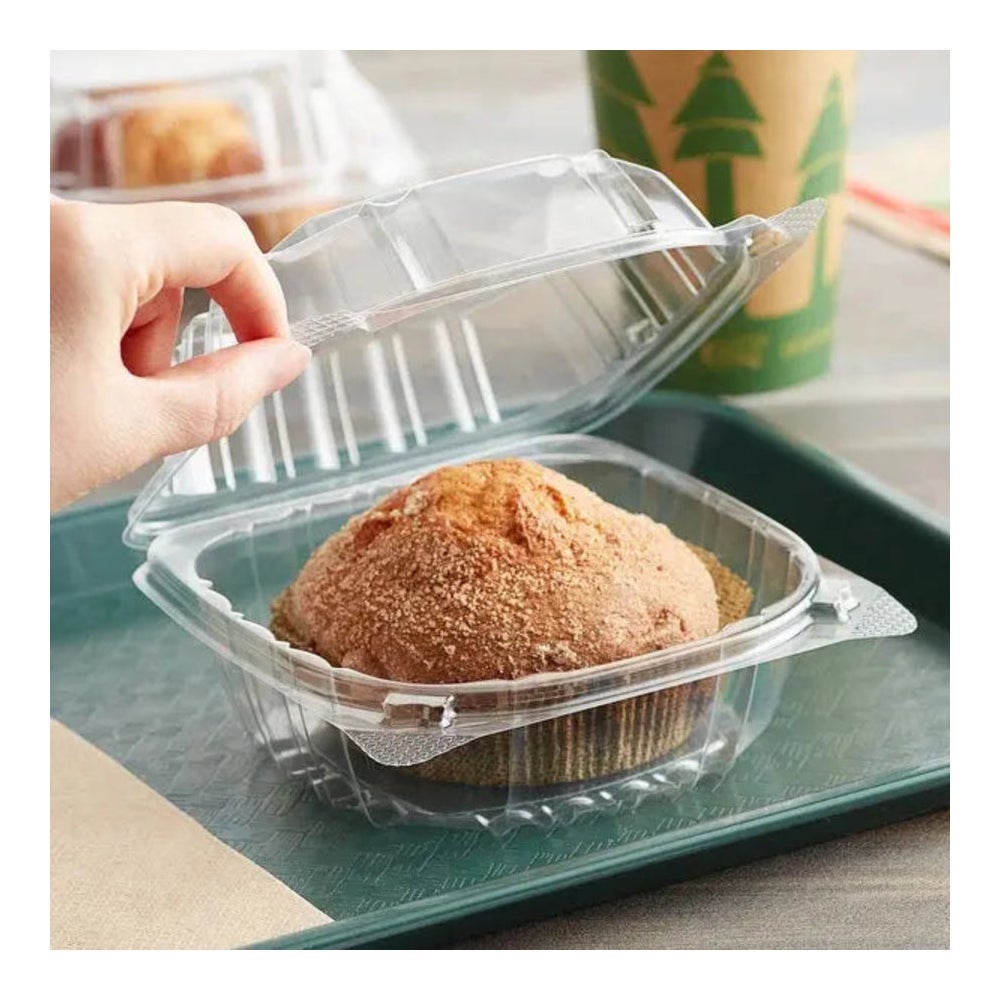 This plastic dessert container features a hinged lid, and is clear for visibility of contents.