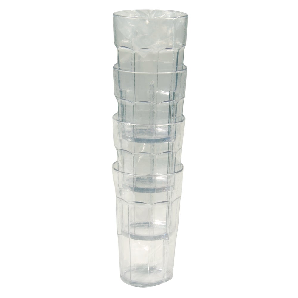 These lightweight tumblers have the look and feel of upscale glass, but are made of break-resistant plastic. The hammered texture catches light and hides water spots and scratches.