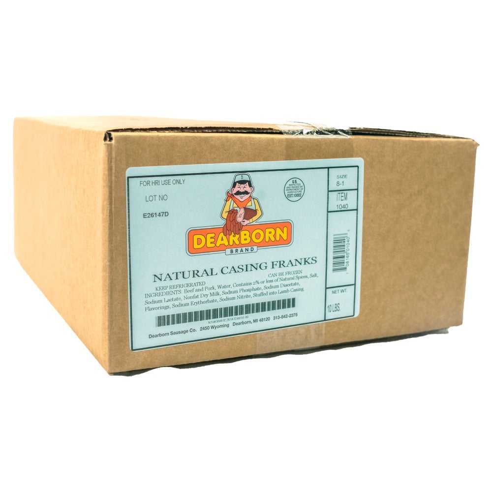 Dearborn Beef & Pork Franks, Natural Casing, 8 Count per Pound, Fresh, 10 Lb Package, 1/Case