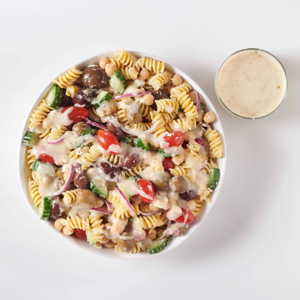 • Described as ranch dressing with a Mediterranean twist, this dressing is perfect for a classic Greek salad: romaine lettuce, cucumbers, green bell peppers, cherry tomatoes and kalamata olives.