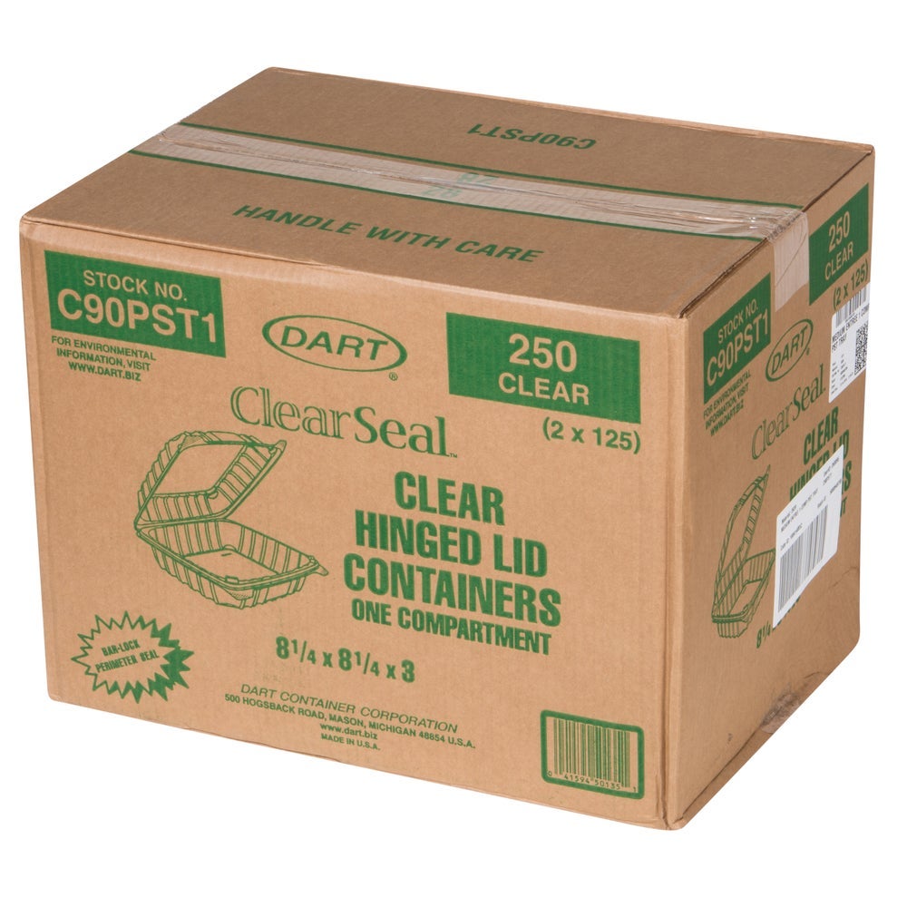 Dart 8.3 x 8.3 x 3 Inch Plastic Containers, Clear, Hinged, Polystyrene, 250 Ct Package, 1/Case