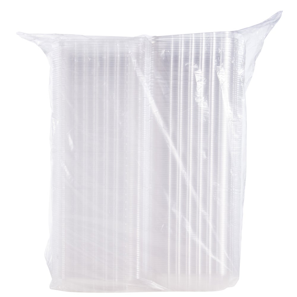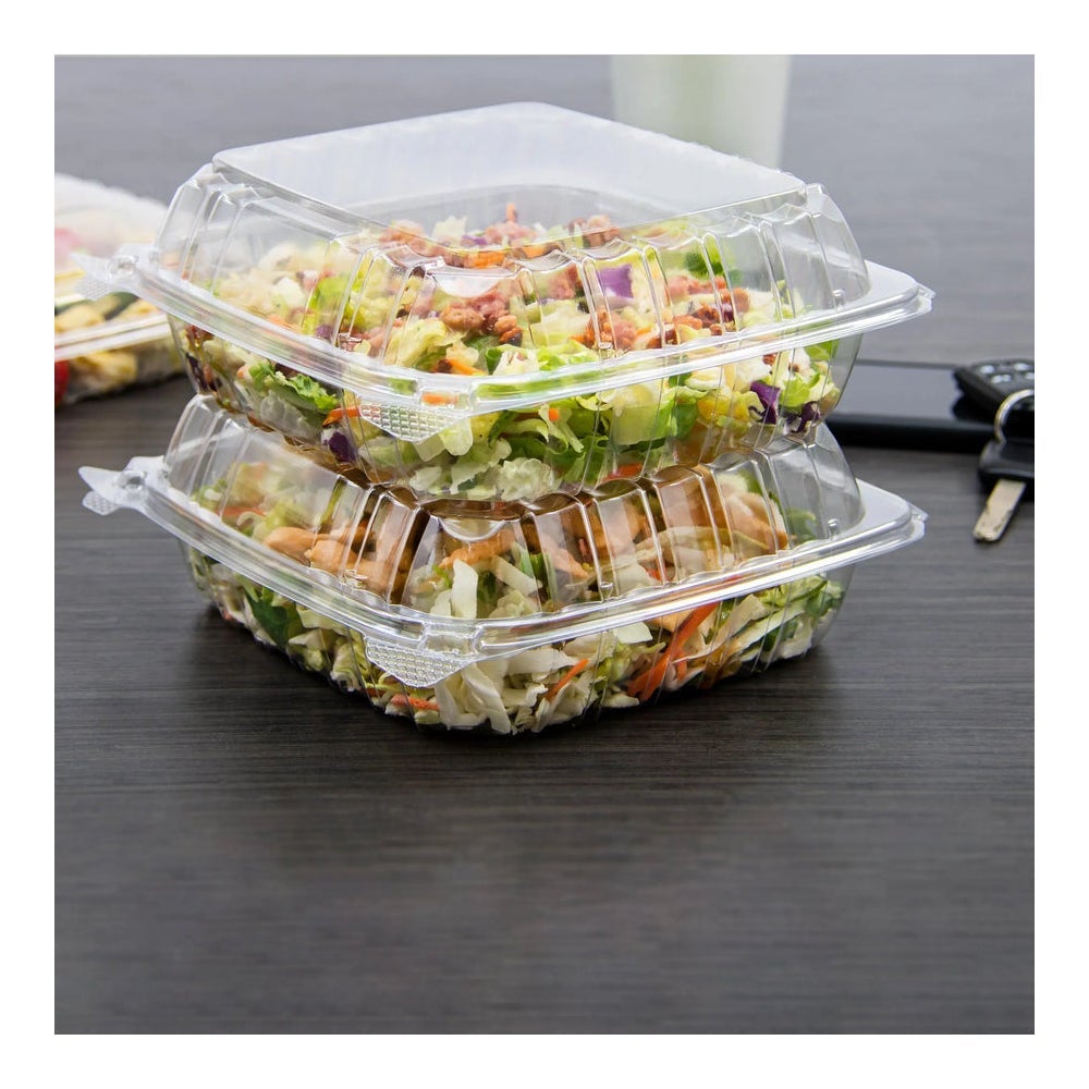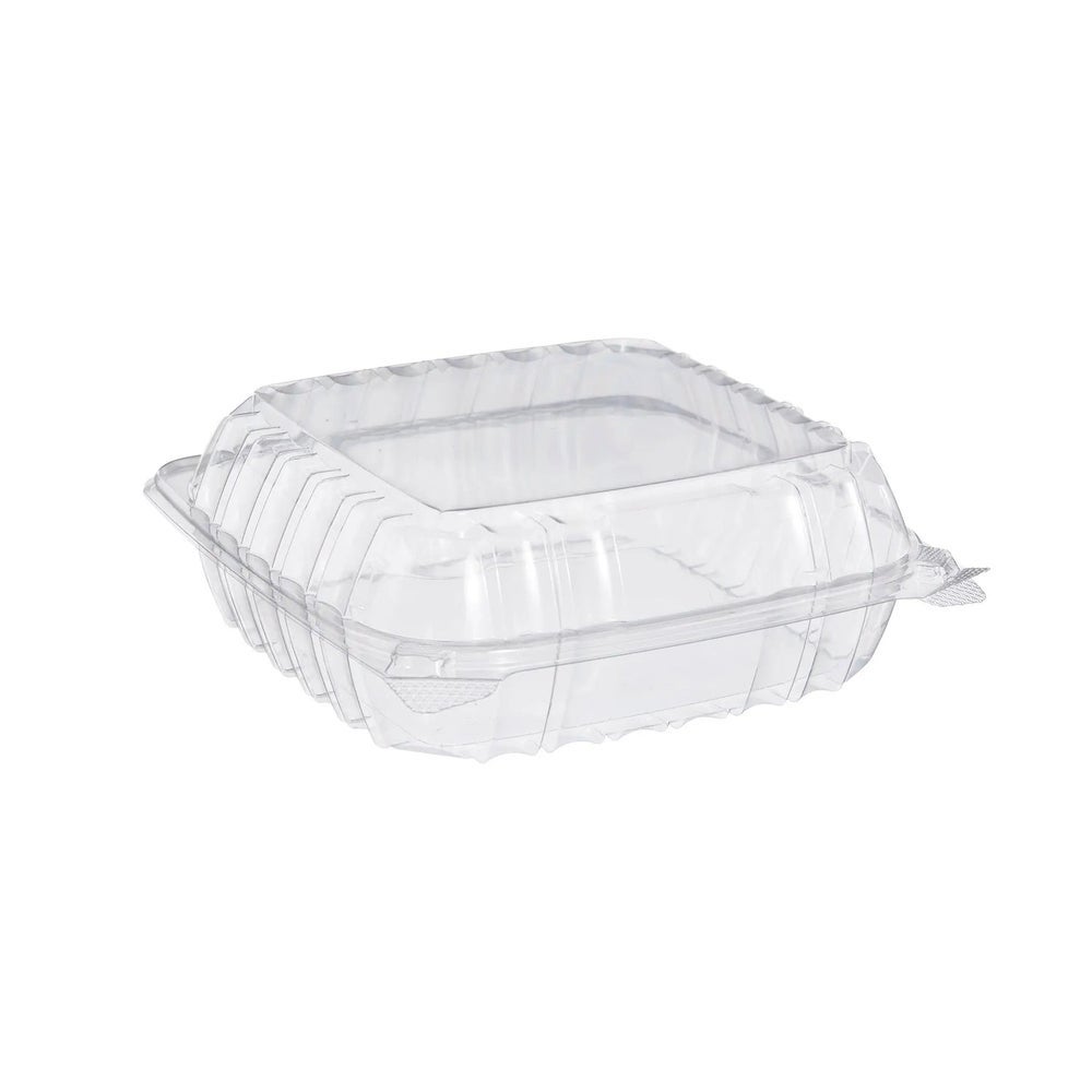 These clear, 9 x 9 inch hinged ClearSeal containers offer a perimeter seal with an audible snap closure. Dual offset opening tabs provide ease of use.