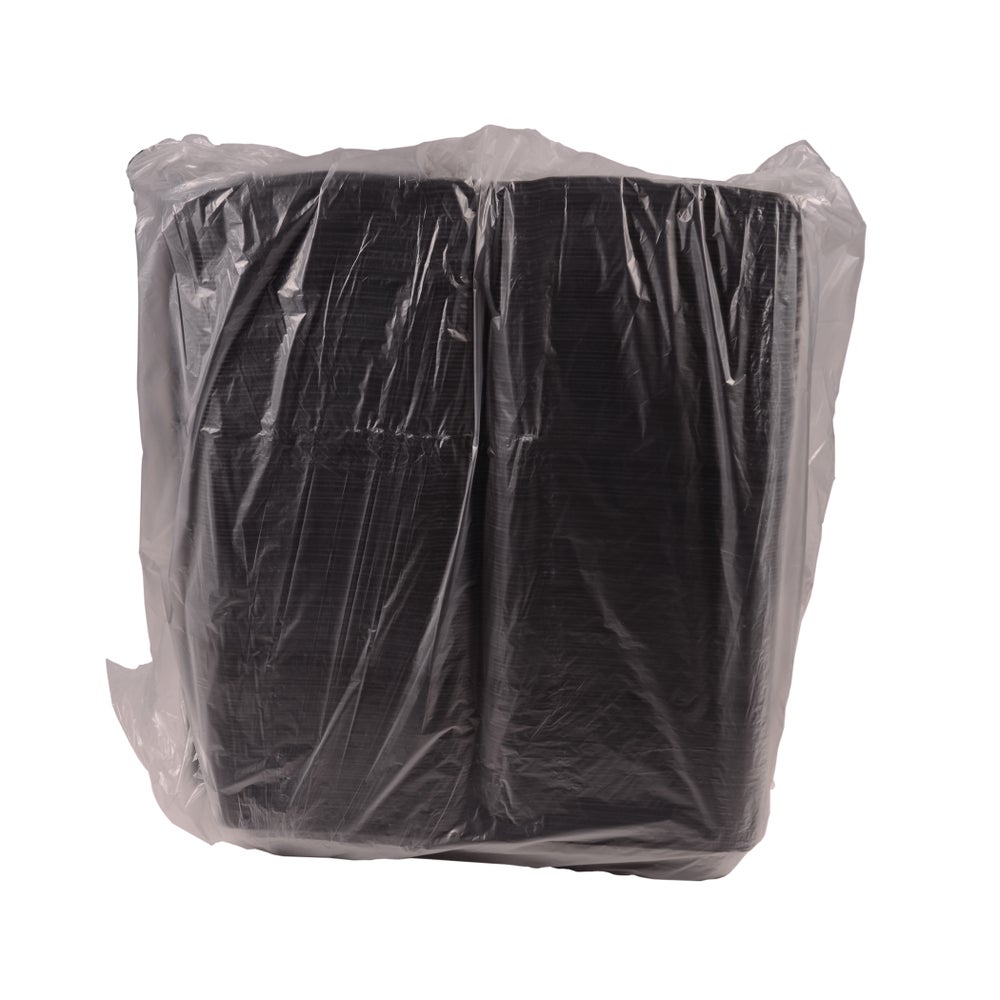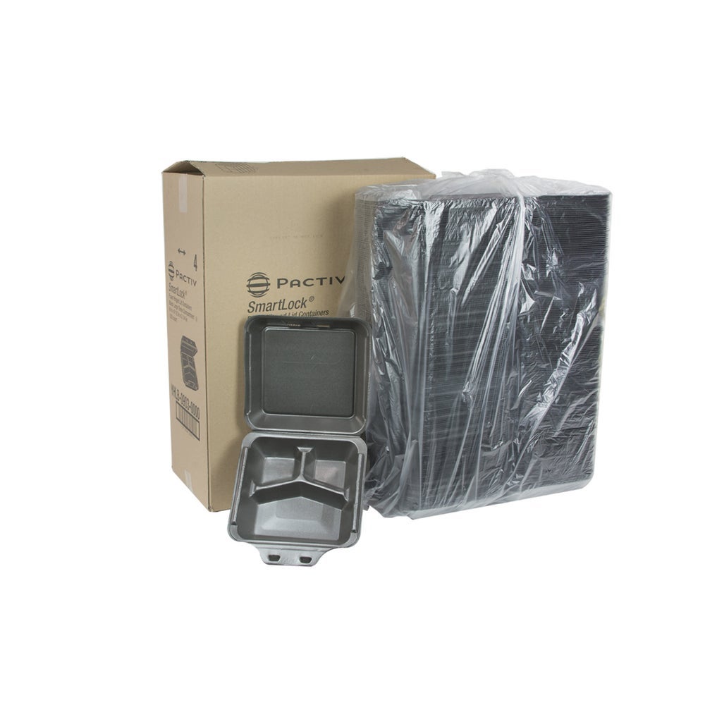 Containers, 3-Compartment, Large 9 x 9.5 x 3.25 Inch, Foam, Black, Hinged, Polystyrene, 150 Per Case