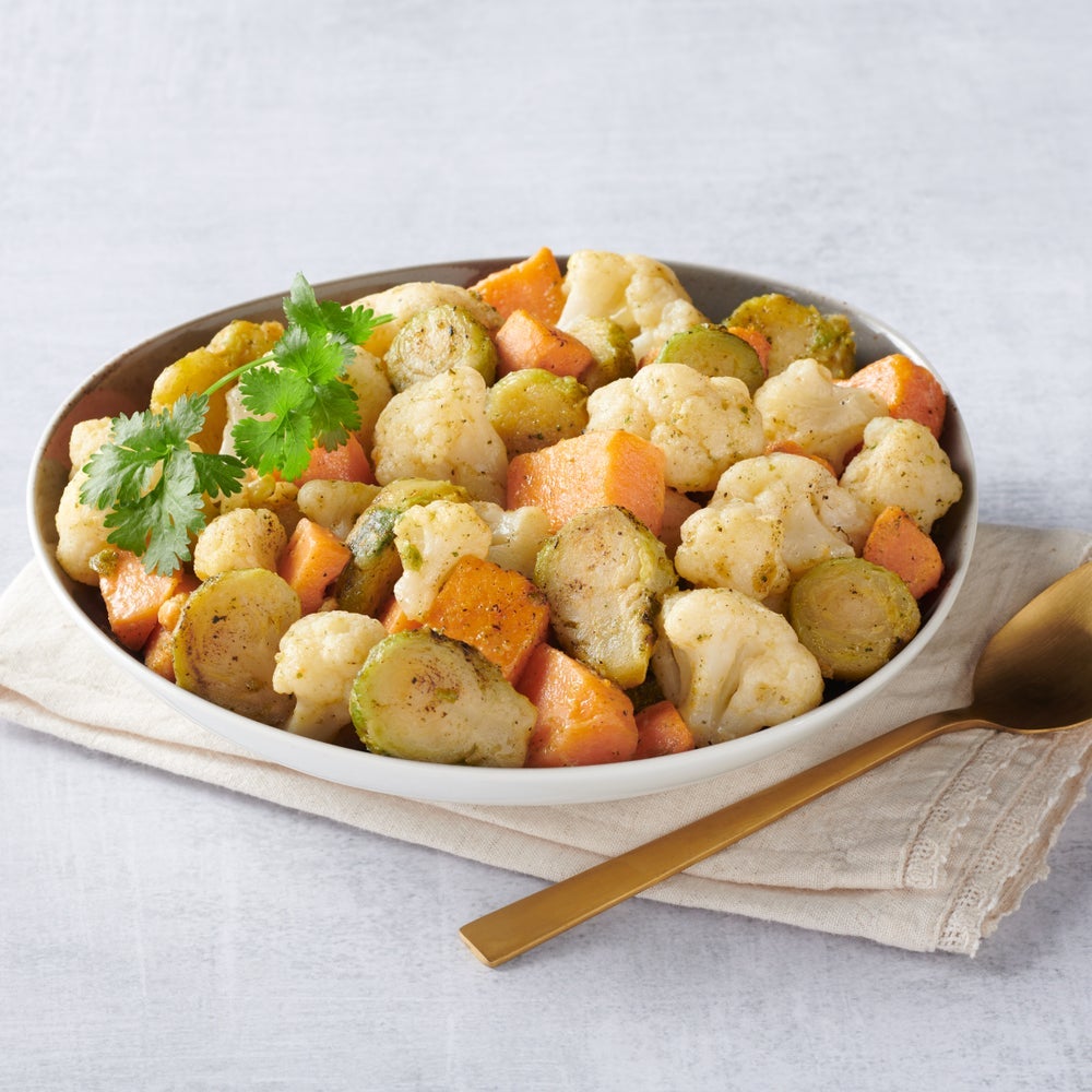 - This harvest vegetable blend features cauliflower, brussel sprouts and sweet potatoes.