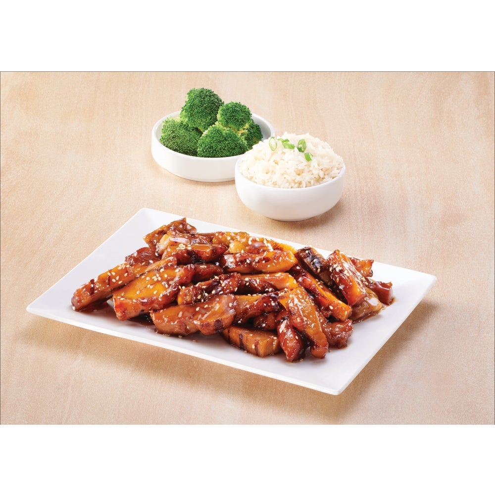 This fully cooked entree offers tender, seasoned chicken strips which have been caramelized in a sweet teriyaki sauce.