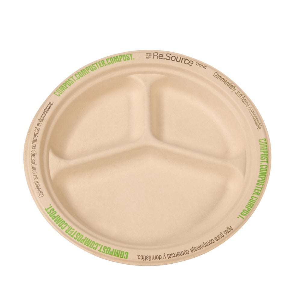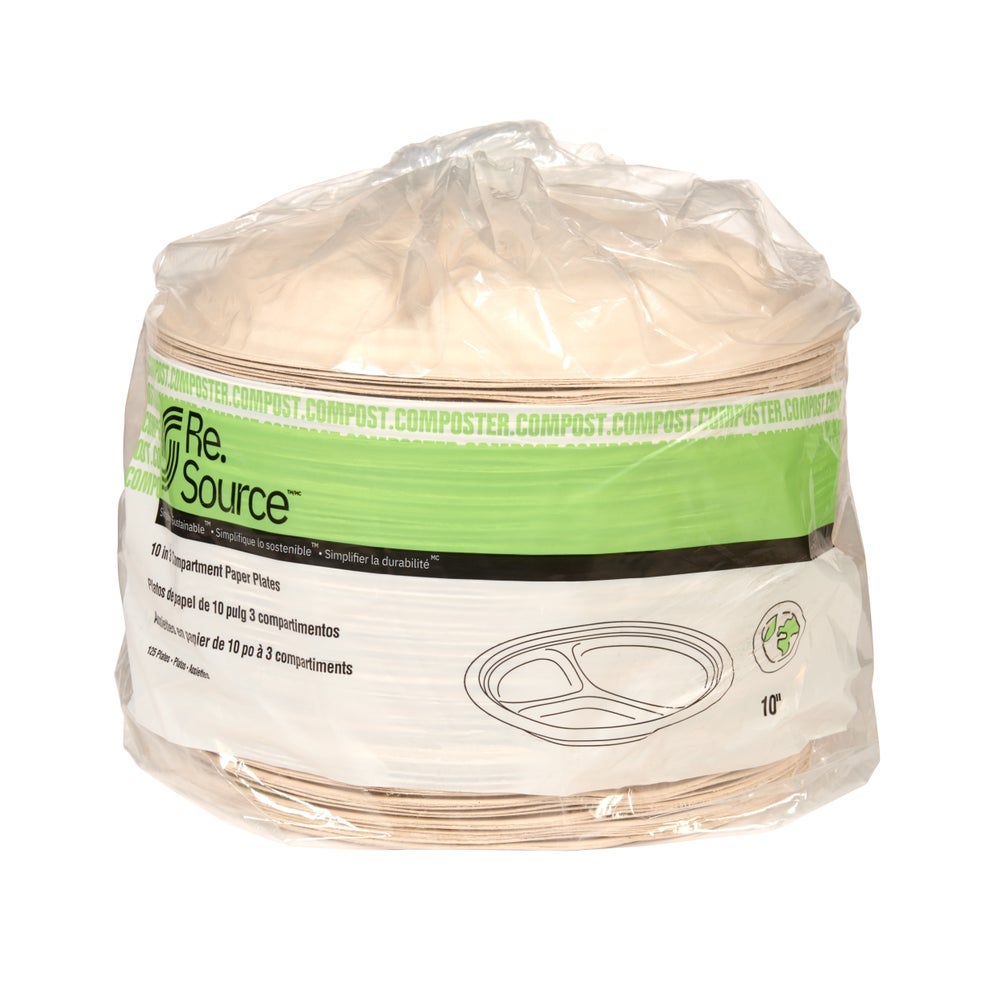 Re.Source 10 Inch Molded Fiber 3-Compartment Plates, Natural Color, Compostable, 125 Ct Package, 4/Case