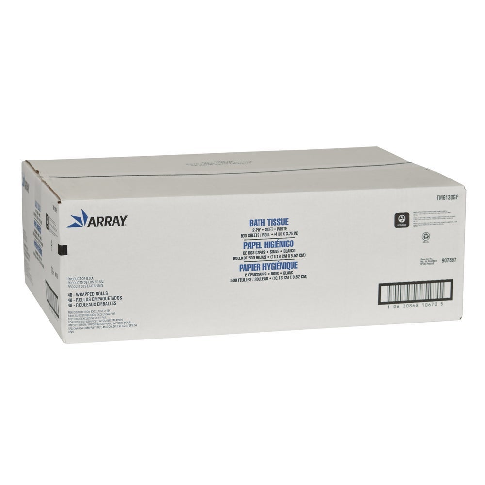 Array 2-Ply Embossed Standard Roll Toilet Tissue, White, 4.2 x 3.75 Inch Sheets, Individually Wrapped, 500 Ct Roll, 48/Case
