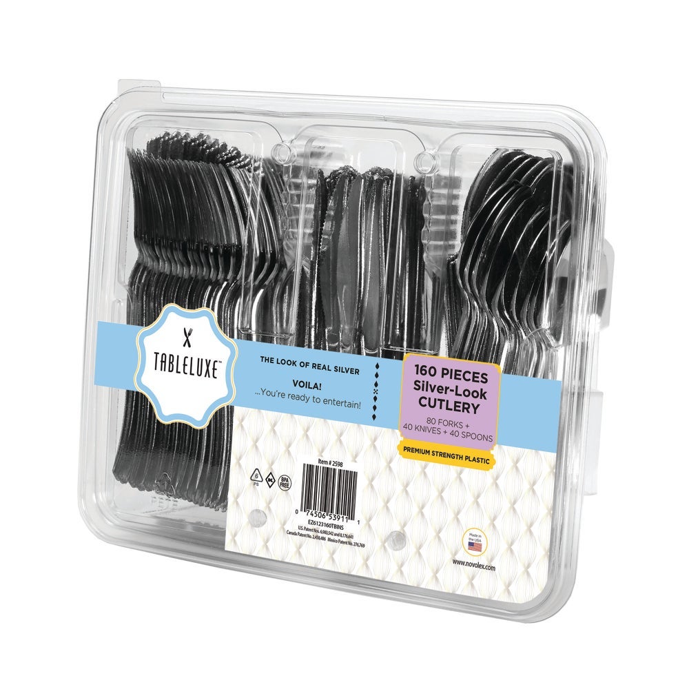 Tableluxe Plastic Fork/Knife/Spoon Cutlery Kits, Black, Polypropylene, 160 Ct Package, 4/Case