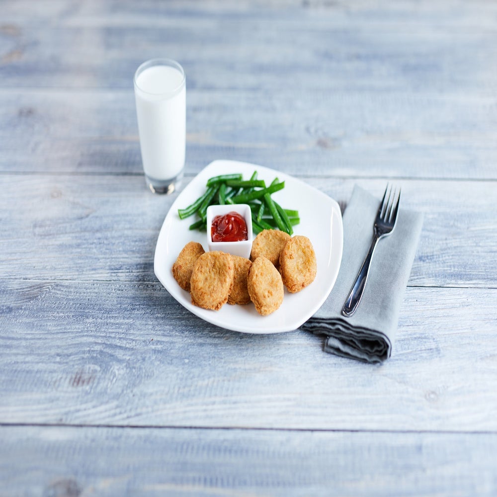 - Cinco nuggets de pollo crujientes, dorados y de grano entero, de 20 gramos cada uno, te dan 57 gramos de equivalente en carne/alternativa a la carne y 28 gramos de equivalente en granos para los Requerimientos del Patrón de Comidas para Niños.