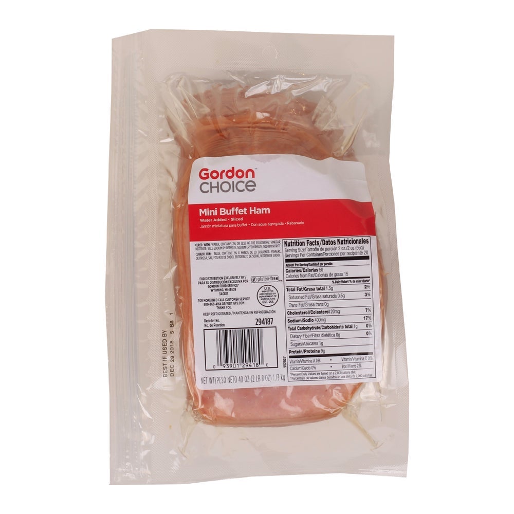 Jamón redondo de 4 pulgadas, ahumado con nogal, con agregado de agua, rebanadas de 0.5 onzas, magras, frescas, 2.5 Libr Paq, 4/Caj