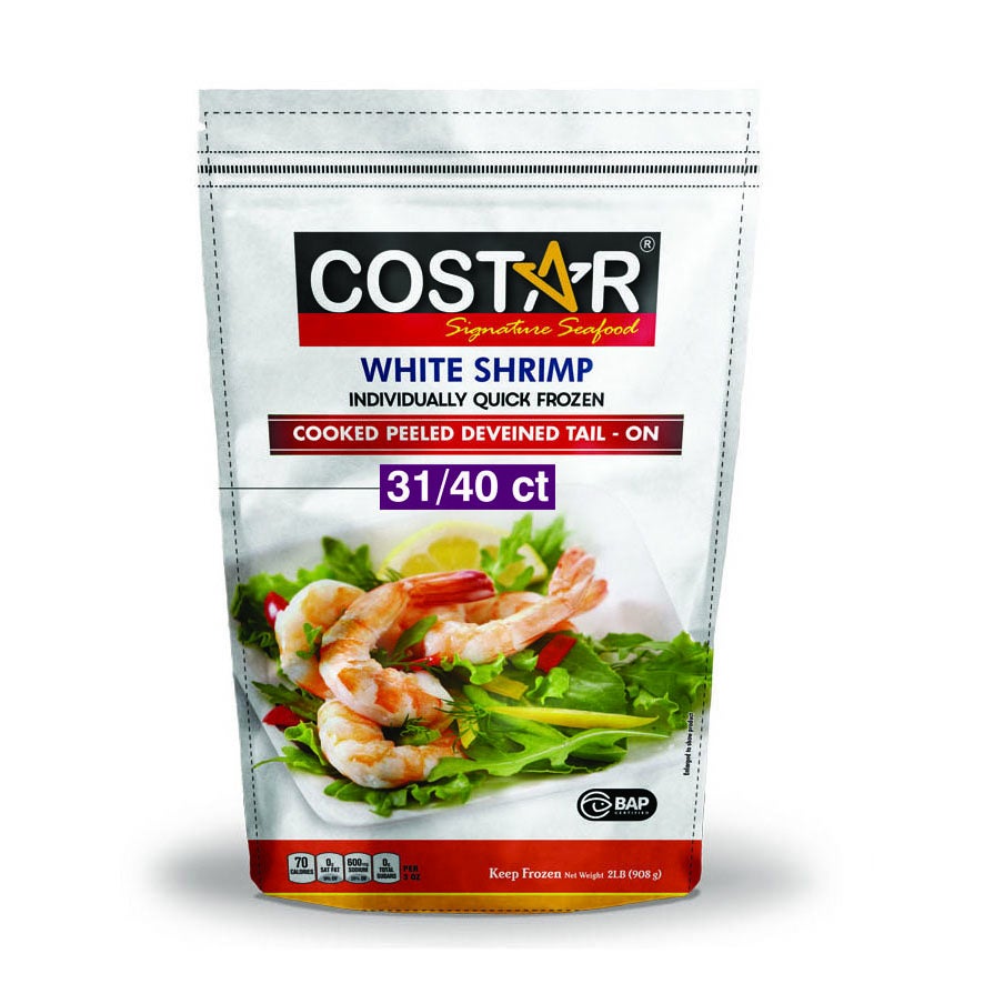 Camarones blancos, pelados y desvenados con cola, 31-40 unidades por libra, cocidos, IQF, bolsa de 2 libras, 5/Caj