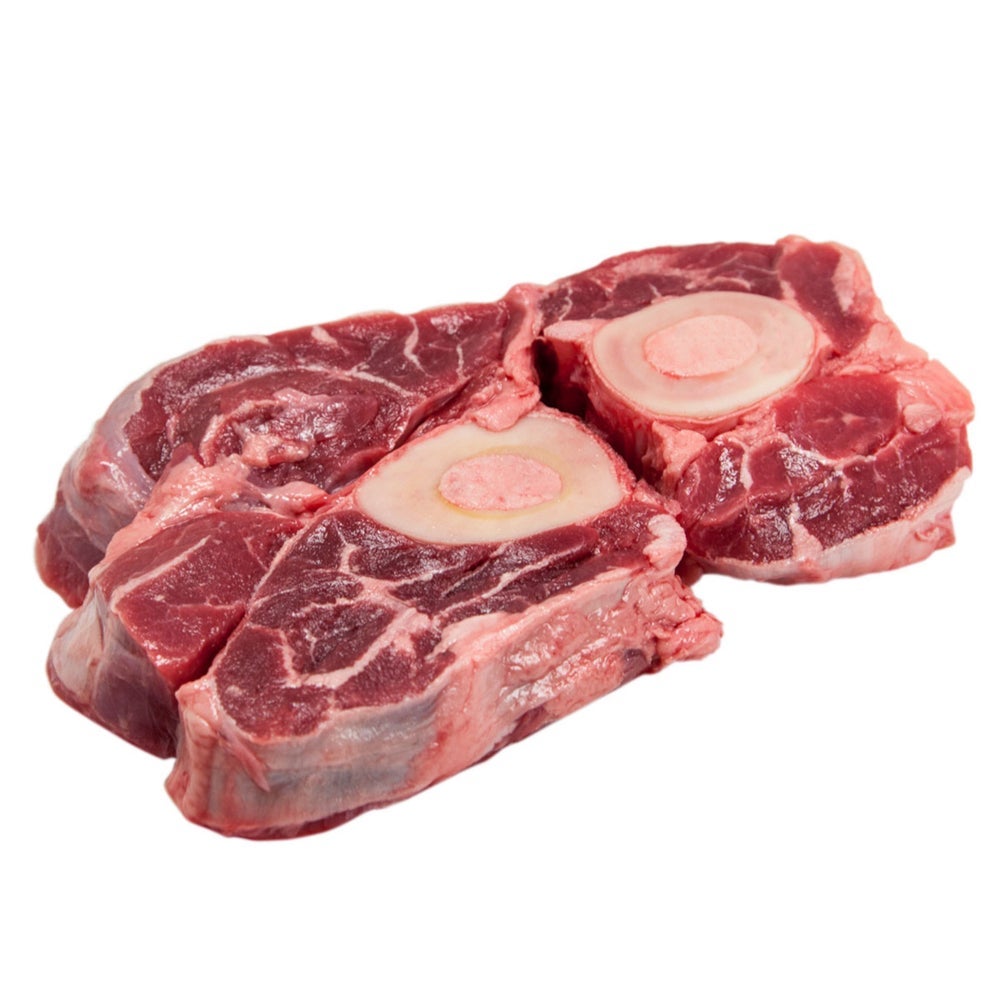 Espinillas de ternera, con hueso, corte transversal, 1 pulgada de grosor, congelado, 1 onza, bolsa promedio de 0.83 lb, 0.83 Plb Bol, 24/Caj