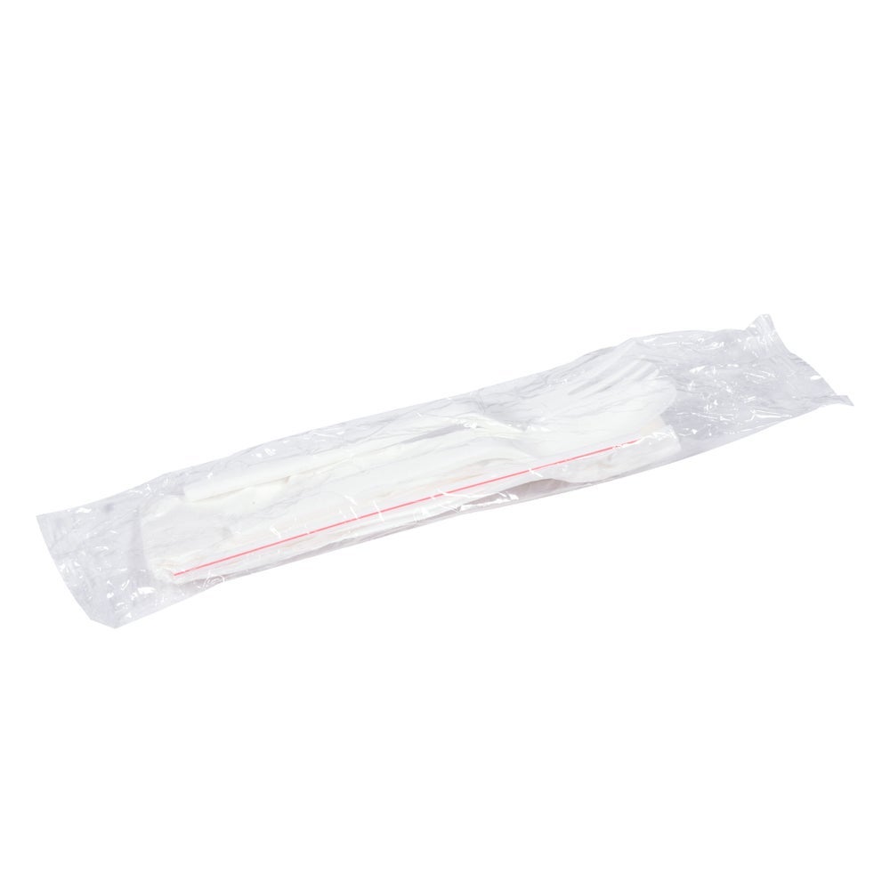 Cubiertos de tenedor y cuchara de plástico de peso medio, blanco, con servilleta y paja, polipropileno, 1 Cda, 500/Caj