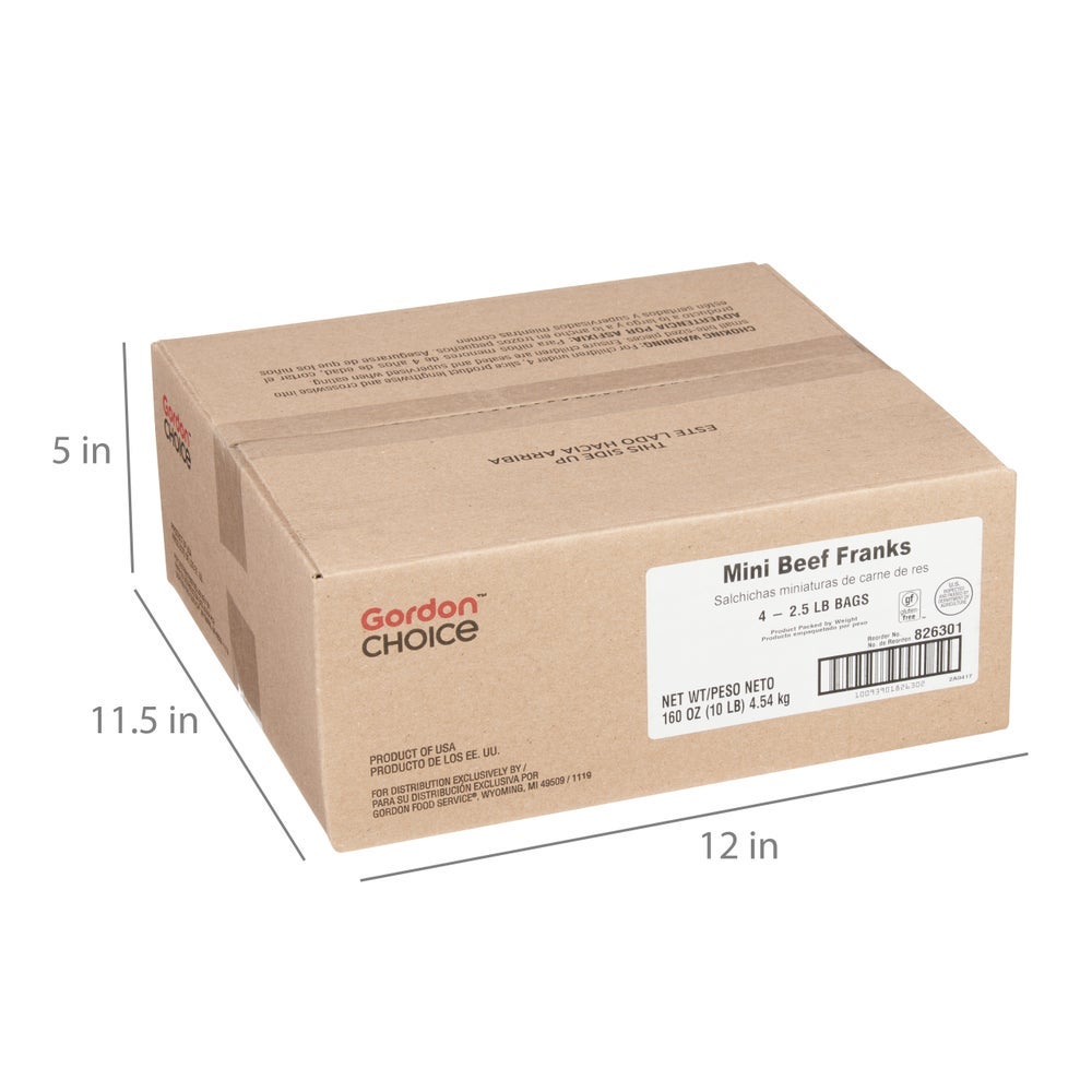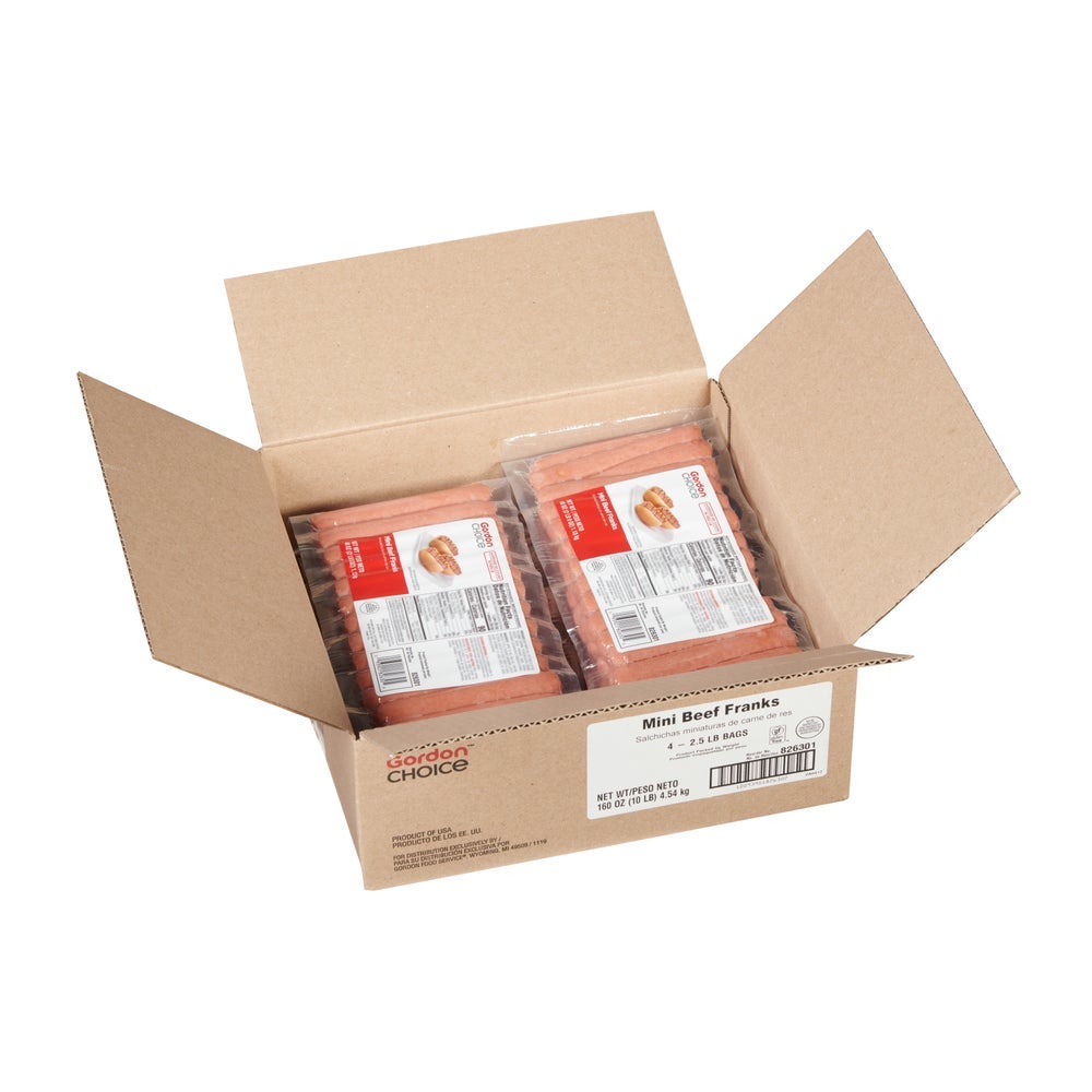 Salchichas de res, Mini, 4.5 pulgadas, 16 unidades por libra, frescas, 2.5 Libr Paq, 4/Caj