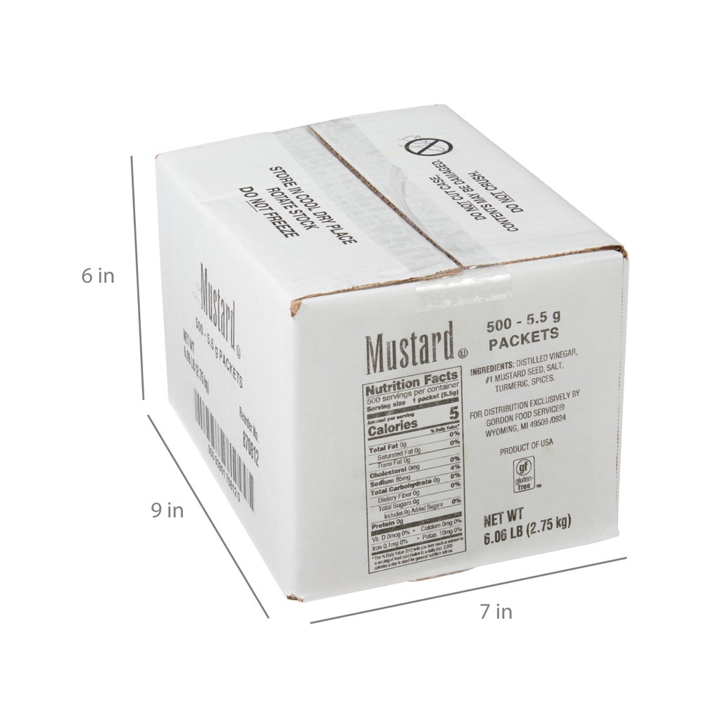 - Cada paquete contiene 5.5 gramos de mostaza, 500 paquetes por caja.