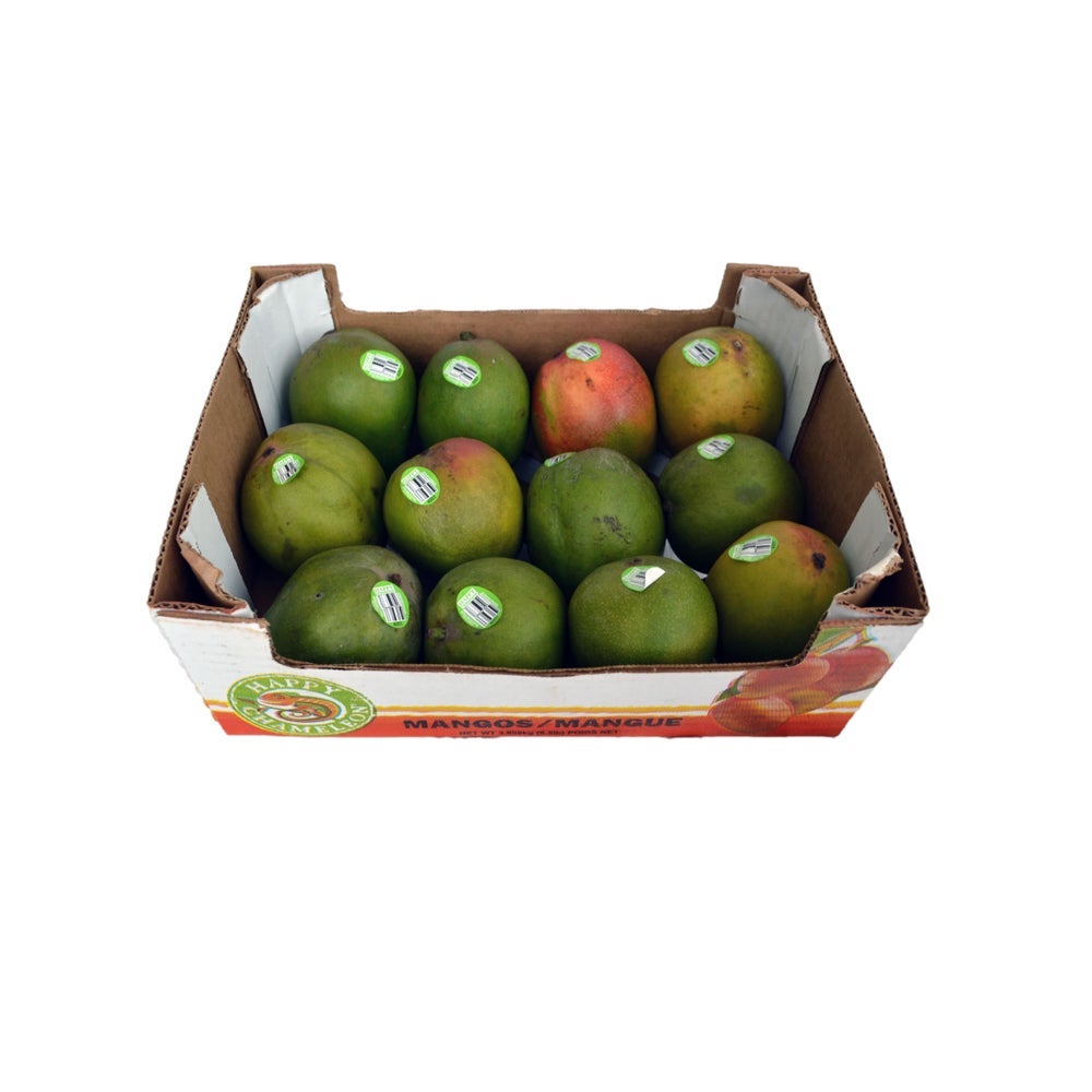 These mangoes are round to oval fruits with juicy, yellow-orange flesh surrounding a flat seed. The skin may appear yellow-green to yellow with a red blush, depending on ripeness. Brand may vary.