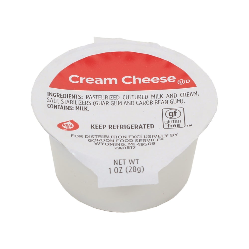 - The cream cheese is individually portioned in cups to maintain portion and cost control. Keep refrigerated until ready to use.