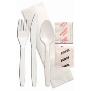 These wrapped cutlery kits contain a reliable medium-weight knife, fork, spoon, and napkin, along with salt and pepper. They are ideal for use with take-out applications, and packed lunches.