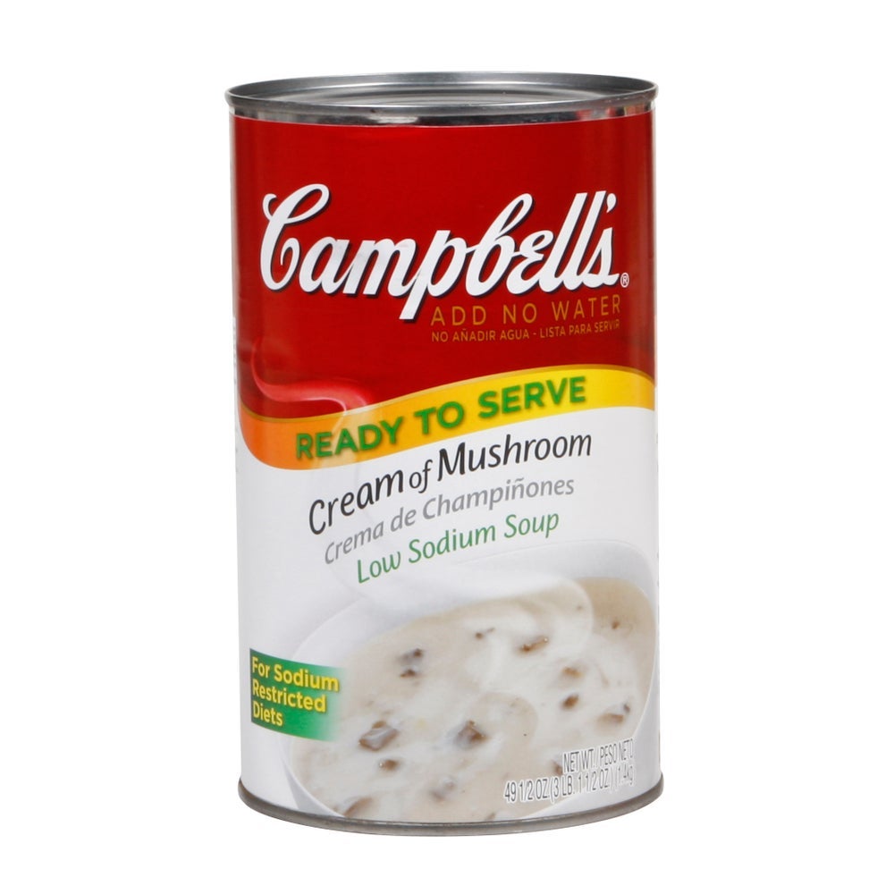Campbell's Low-Sodium Cream of Mushroom Soup, Canned, 5 Can Sz Can, 12/Case