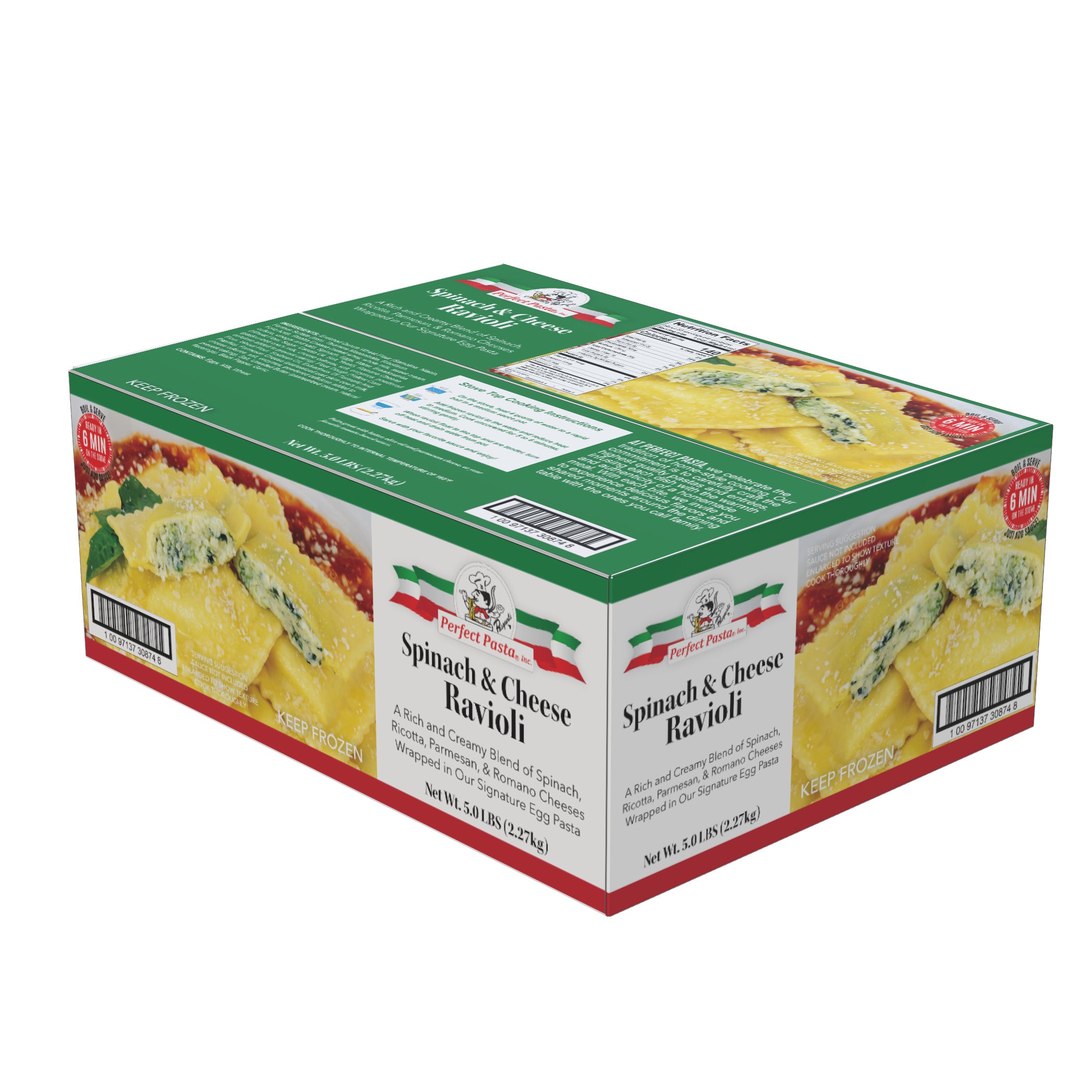 Perfect Pasta Spinach & Cheese Ravioli Pasta, Frozen, 5 Lb Box, 1/Case