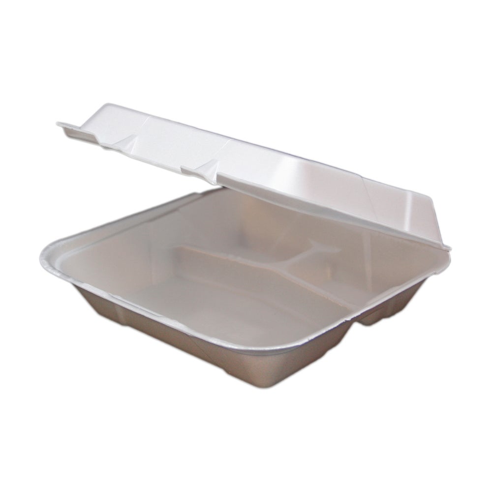 Containers, 3-Compartment, 9 x 9 x 3 Inch, Foam, White, Hinged, 1 Each, 100 Ct Bag, 2 Per Case