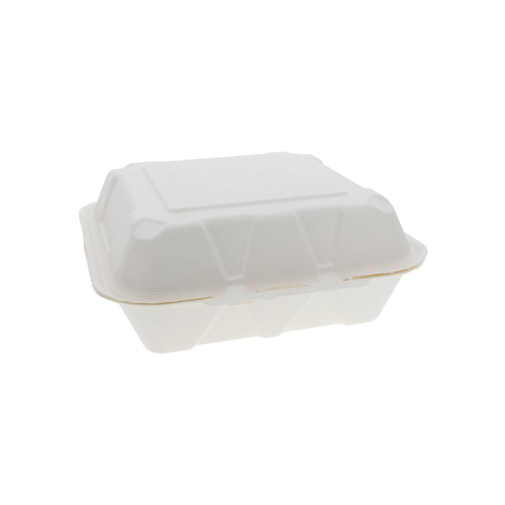 These molded fiber containers are processed chlorine-free to create an all-natural white appearance. The blend of sustainable, renewable fiber, and pulp materials reflects a commitment to the environment and sustainable products. Features a double-tab closure.