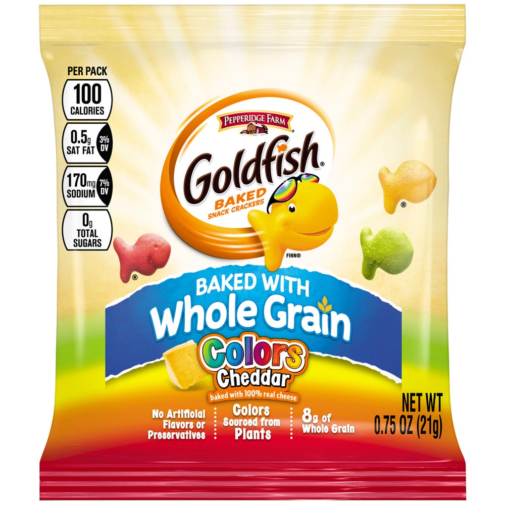 - Nutrition Matters: A delicious wholegrain-rich and Wholesome Snack kids love, Goldfish Colors Made with Whole Grain Crackers contain 0 grams of trans fat per serving, no artificial flavors or preservatives, and are Smart Snack compliant.