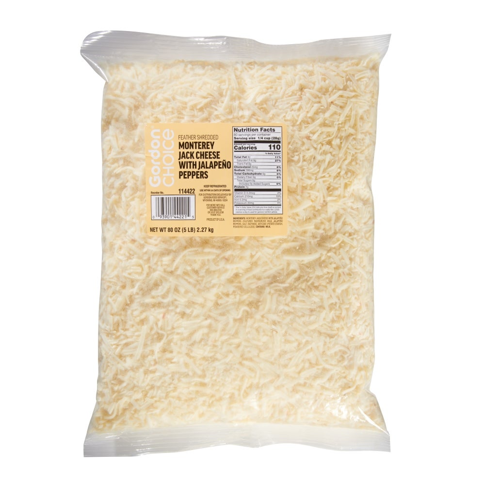 Gordon Choice Pepper Jack Cheese, Feather Shredded, 5 Lb Bag, 4/Case