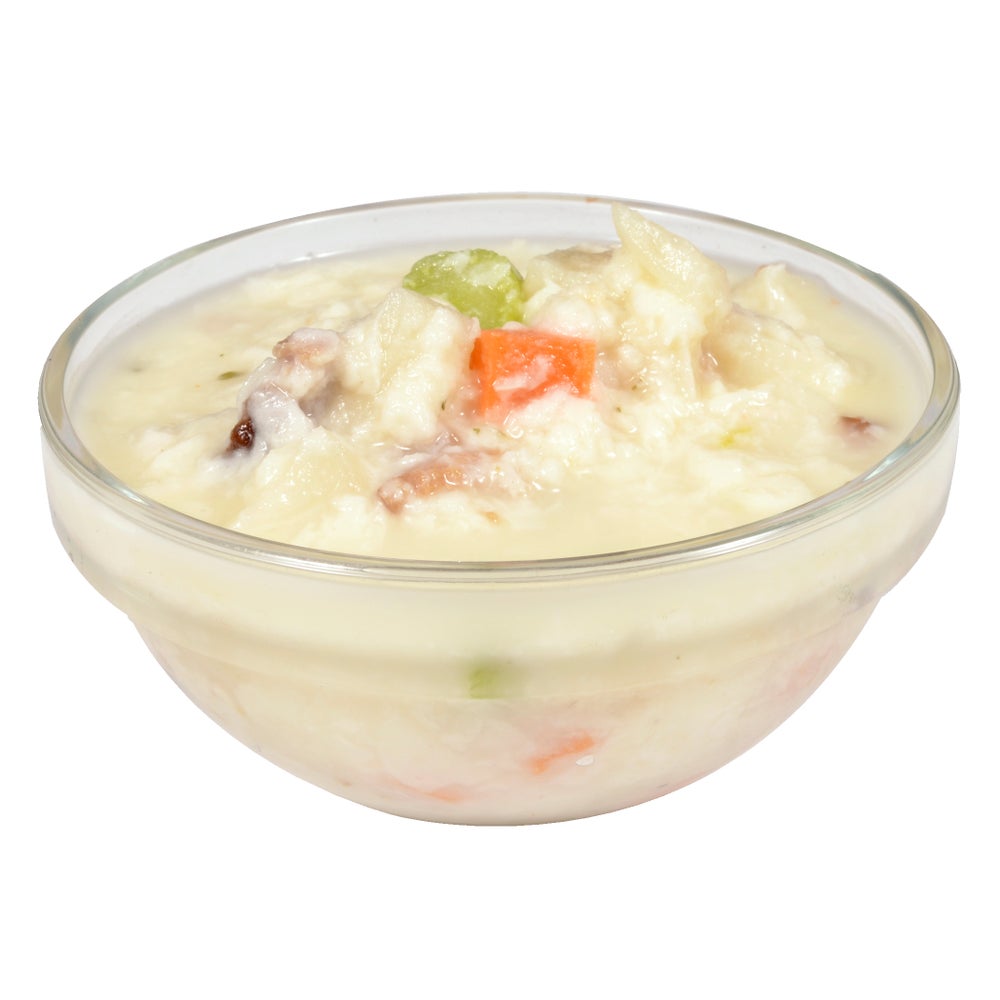 - This classic favorite features large chunks of garden-fresh potatoes, tender carrots, crisp celery and green bell peppers seasoned with garlic, parsley and savory pieces of real bacon for a light smokiness. No MSG or preservatives are added.